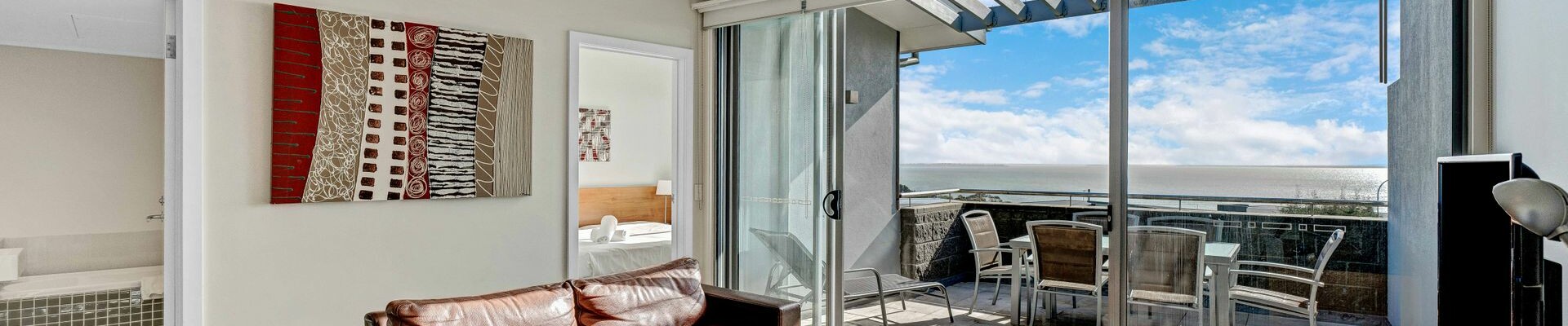 The central open plan Kitchen/Dining room opens to the Living Room (with smart TV & delightful ocean views) provides space to relax in privacy. There are two bedrooms - the main with ocean views, and both have built in robes. The bathroom (with bath, shower & toilet) is also accessed off the central Living Room as is the Laundry (with a combined washing machine/dryer).