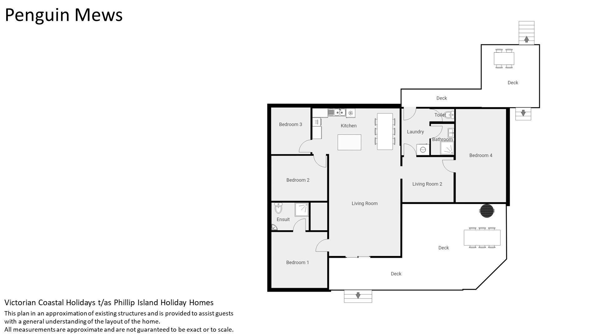 The home opens into the open plan Living/Kitchen/Dining (with TV, Blu tooth stereo, DVD player & a small library of movies). Off this area is Bedroom 1 with an ensuite (with shower & toilet) as well as Bedrooms 2 and 3. A small second Living room leads to Bedroom 4, a fully equipped Laundry (with washing machine & clothes dryer) and the Bathroom (with Shower over a hip-bath and separate toilet).