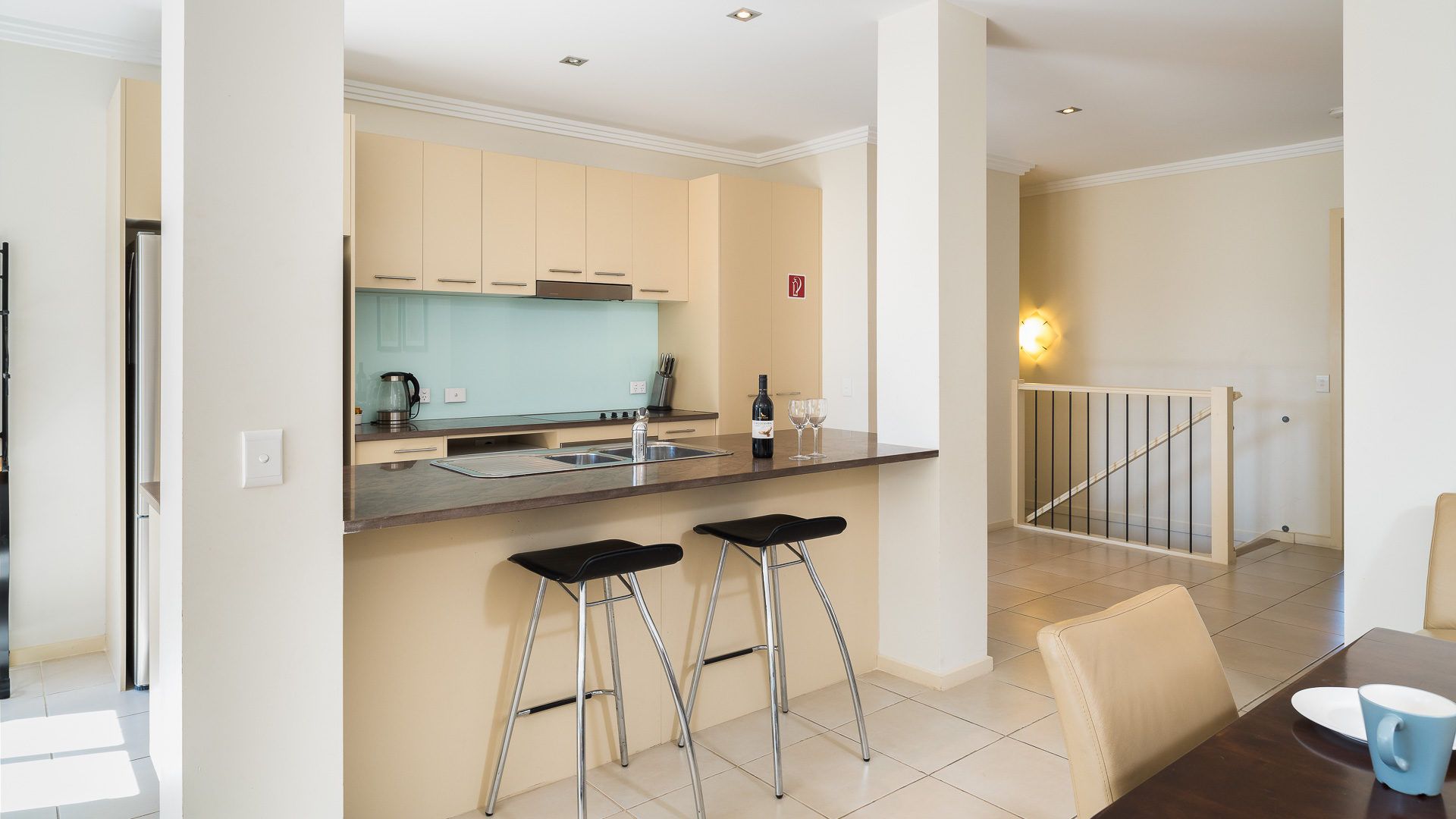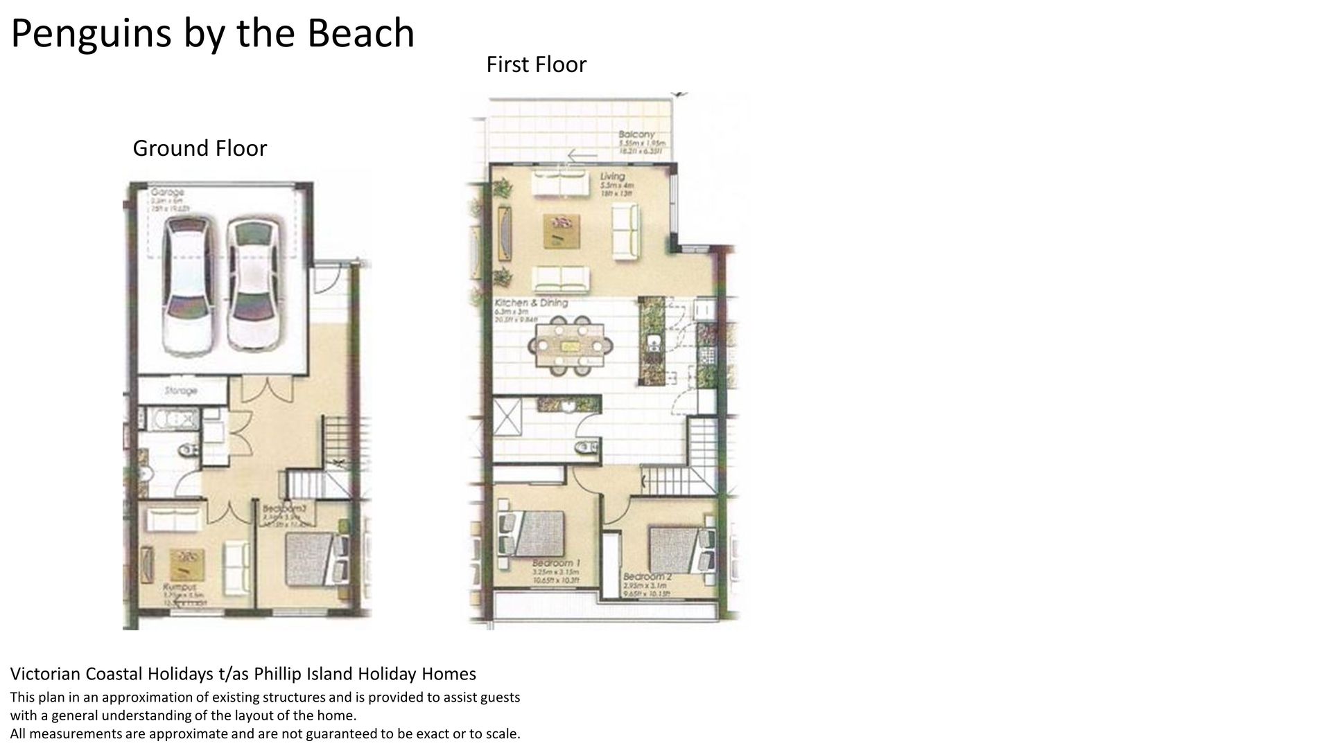 Downstairs is the second Living room (with Samsung 65" Smart TV), Bedroom 1, a Bathroom (with shower over bath and toilet), and internal access to the Garage. A fully equipped European laundry (with washing machine and clothes dryer) is in the hallway. Upstairs is the open plan Kitchen/Dining/Living area (with Samsung 65" Smart TV) opening to a balcony, plus Bedrooms 2 and 3 (each with BIR) and a Bathroom (with shower and toilet).