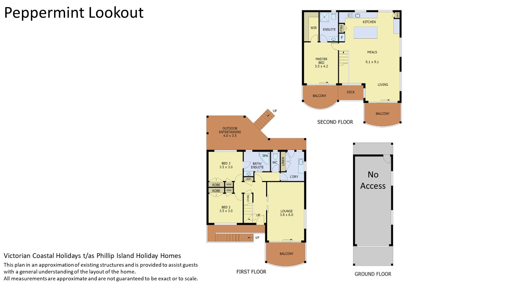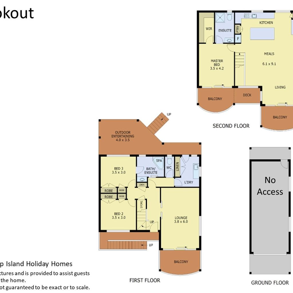 Access to the home is via external stairs to the first floor entrance. There is a first floor front covered Balcony as well as a rear fully covered Entertaining Area (with gas BBQ and Table & chairs for 8 people). The second floor has a Balcony (with 2 armchairs) that looks out over Kilcunda to the Ocean and across a magnificent rural expanse. There is also a private Balcony and Deck off Bedroom 1 (with a 3-seat sofa). The whole block is enclosed, and the rear yard features an enclosed trampoline & firepit (no wood provided). The Garage is not for guest use, but there is space to park up to 3 vehicles (cars and/or a boat) on the driveway.