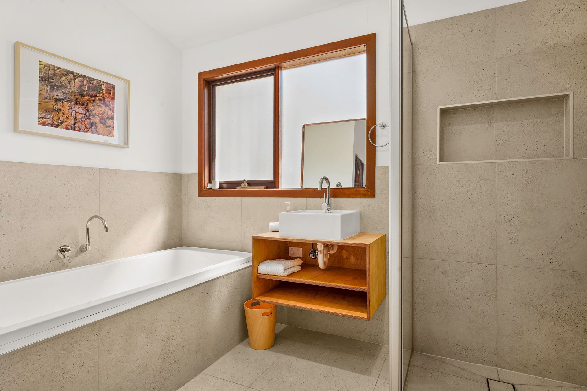 The large open plan Living/Dining Room (with 65" smart TV) opens into the good sized kitchen. Bedroom 3 (with 42" TV, shelf & hanger) opens into the Living Room. The central hallway provides access to Bedrooms 1 and 2 (each with built in robes), a bathroom (with shower, bath & heated towel rail), a laundry (with washing machine & clothes dryer) and a separate toilet off the laundry.