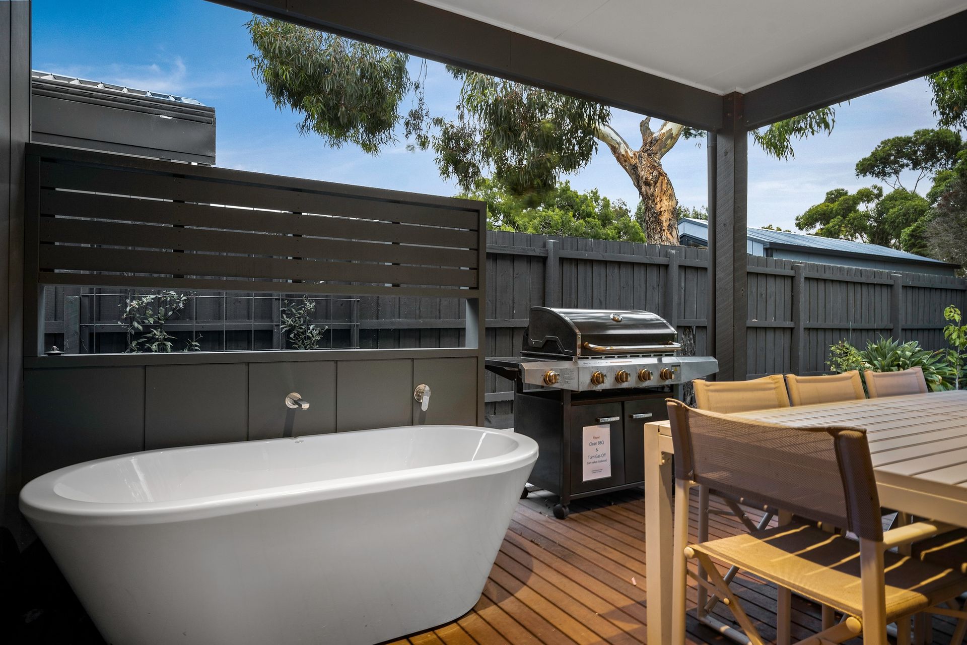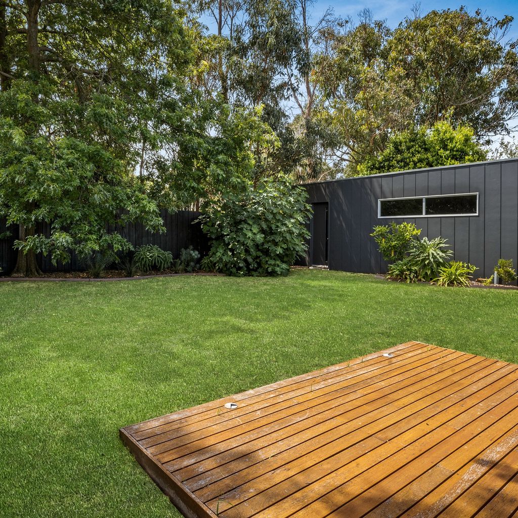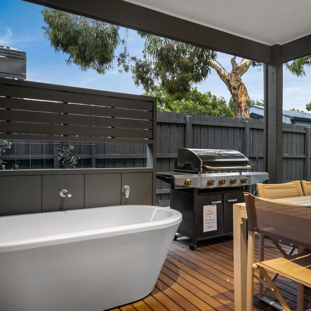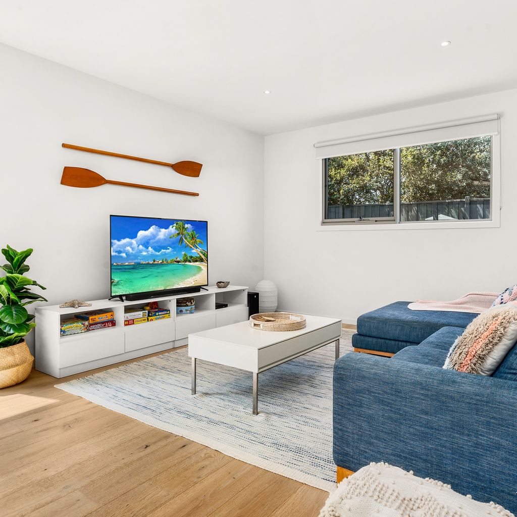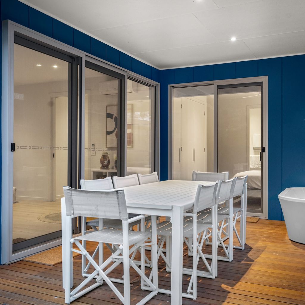 The rear covered deck (with table & chairs for 9 people, 2 x Lounge chairs & a gas BBQ) has a delightful outdoor heated bath with spa jets as well as a heated outdoor shower. The generous fully enclosed backyard is perfect for children and features a cubby house for the kids. The Single garage has been converted into a Games Room with a table tennis table, darts, kayaks, fishing rods, outdoor games and beach equipment. The long driveway can fit up to 4 cars plus there is room to park a boat in front of the house also.