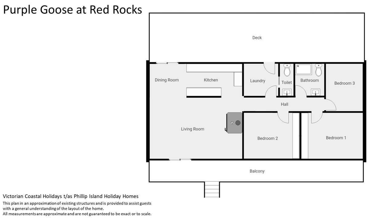 The large open plan Living/Dining Room (with TV, DVD player, Google chrome, tower stereo, 2 x bean bags), provides access to the rear Deck, and flows through to the dual-entrance Kitchen. A Central Hallway leads to Bedroom 1 (with TV, DVD player & BIR), Bedroom 2 (with BIR) and Bedroom 3, the Bathroom (with shower & toilet), and the fully equipped Laundry (with washing machine & clothes dryer) which has a 2nd separate Toilet and additional access to the rear deck.