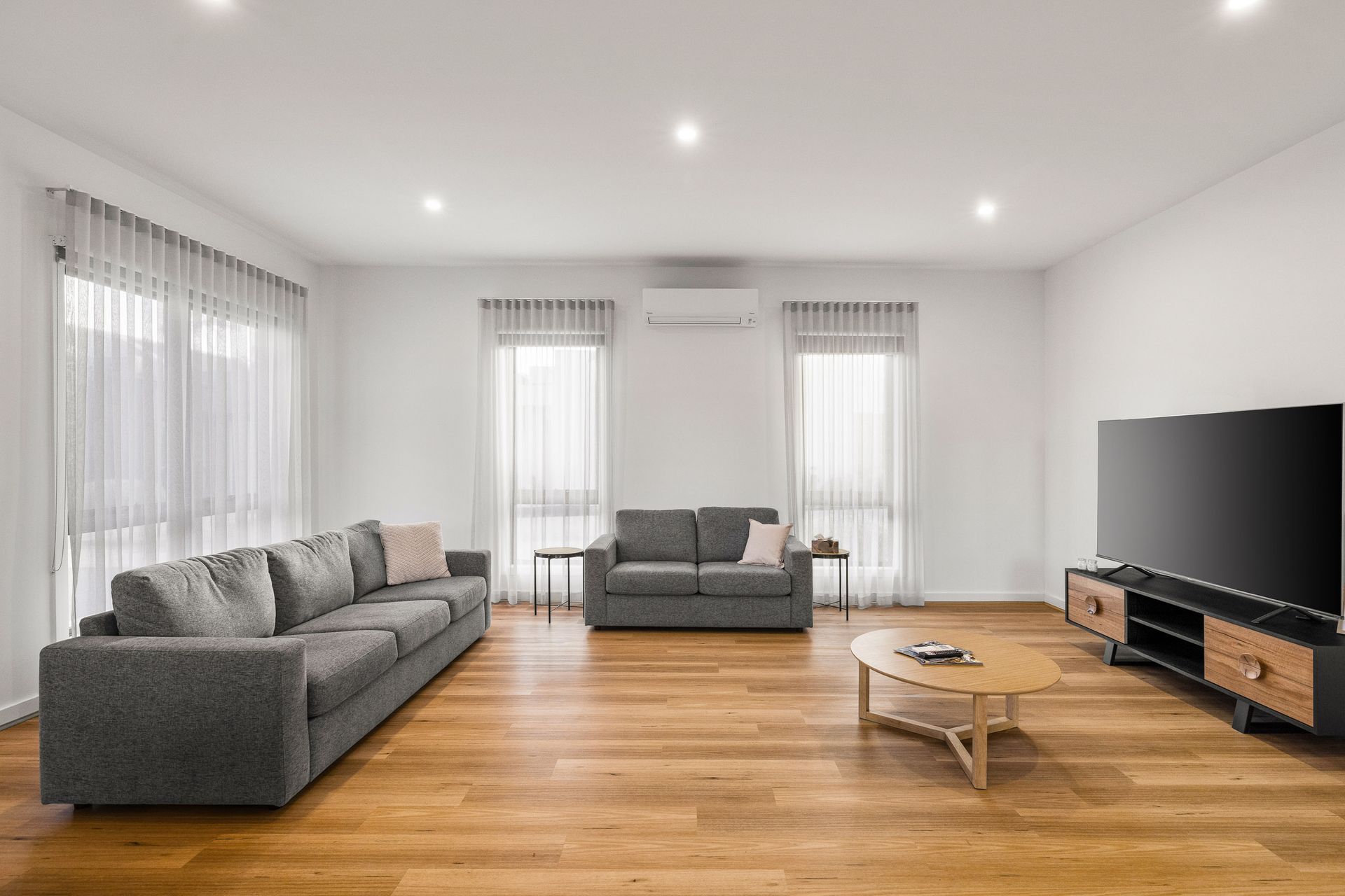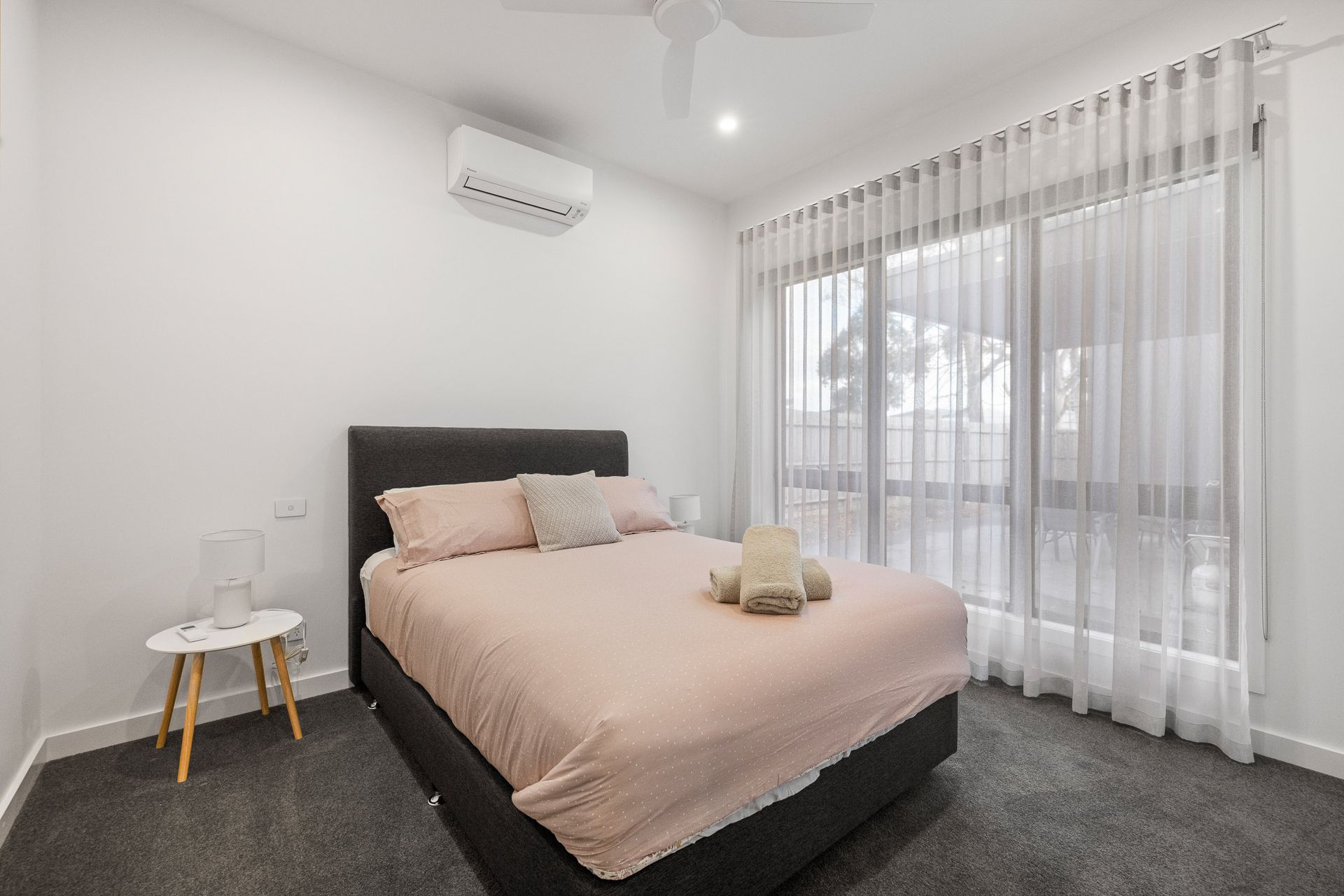 There are four wall mounted reverse cycle air conditioners in the home; one in each of the Bedrooms, plus another in the Kitchen/Dining/Living room, plus ceiling fans in all three Bedrooms.
