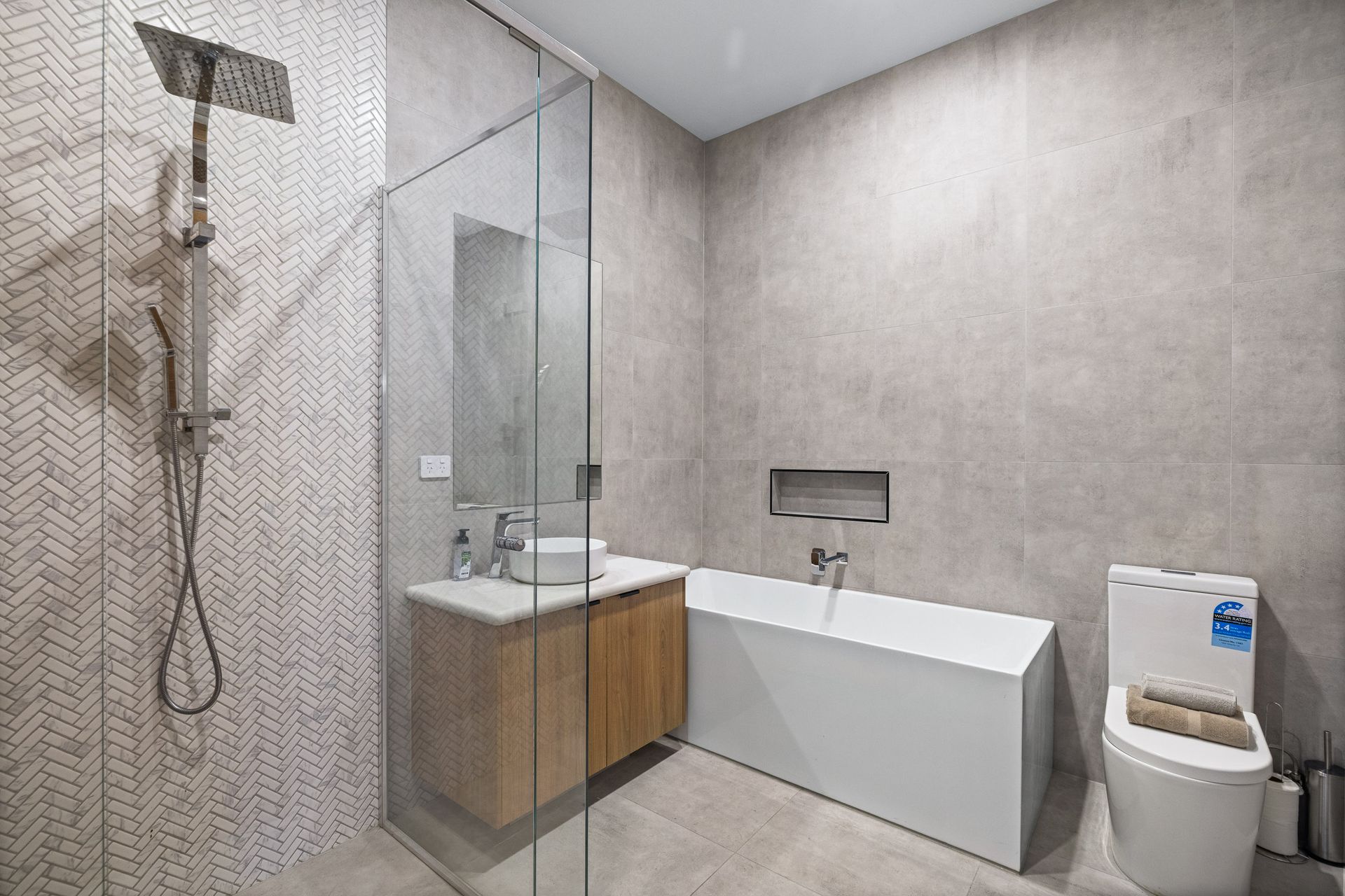 The large open plan Kitchen/Dining/Living Room (with 75" smart TV) flows out to the covered Alfresco and has internal access to the Garage. A central Hallway provides access to a Laundry (with washing machine), Bedroom 2 & 3 (each with BIR), a Bathroom (with shower, bath, toilet & heat lamps) and a separate Toilet. At the end of the hall is Bedroom 1, which features a WIR and ensuite (with shower, toilet double vanity & heat lamps).