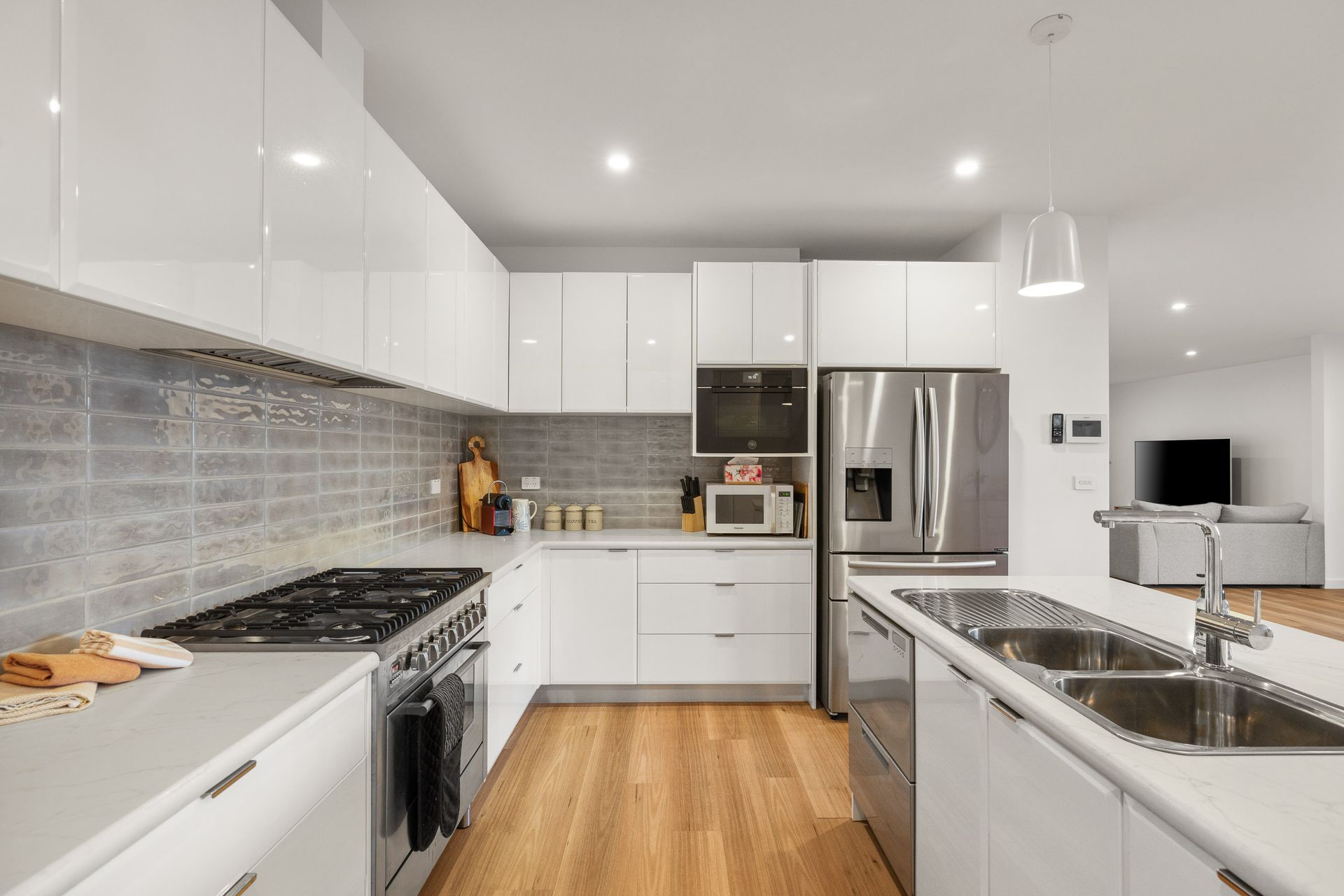 The fully appointed kitchen is equipped with cooking utensils, crockery, cutlery, microwave, Nespresso pod coffee machine, toaster, kettle, etc. plus a double sink, fridge, dishwasher, airfryer, built-in Bertazzoni steam oven, electric oven and gas cook top.