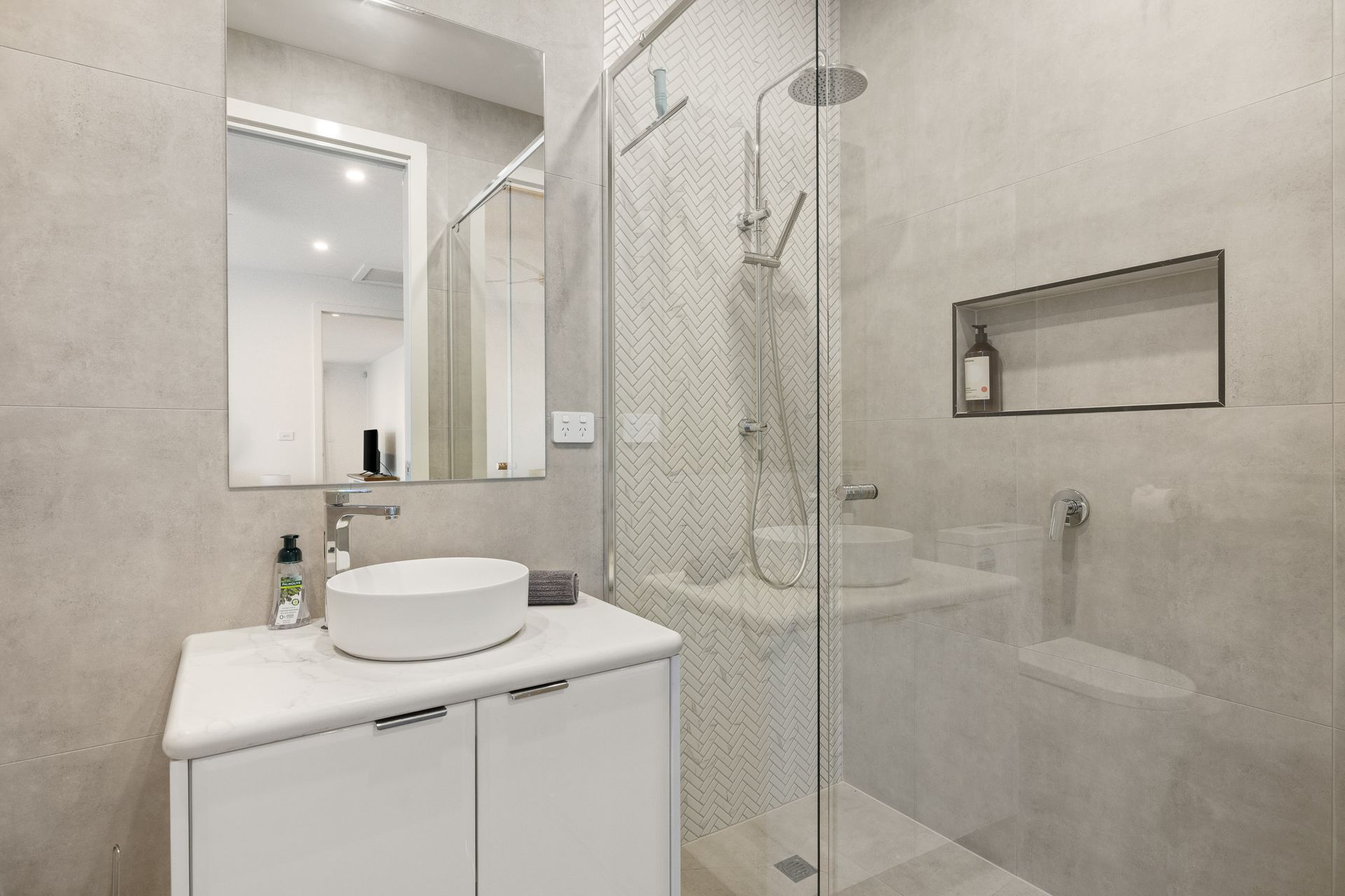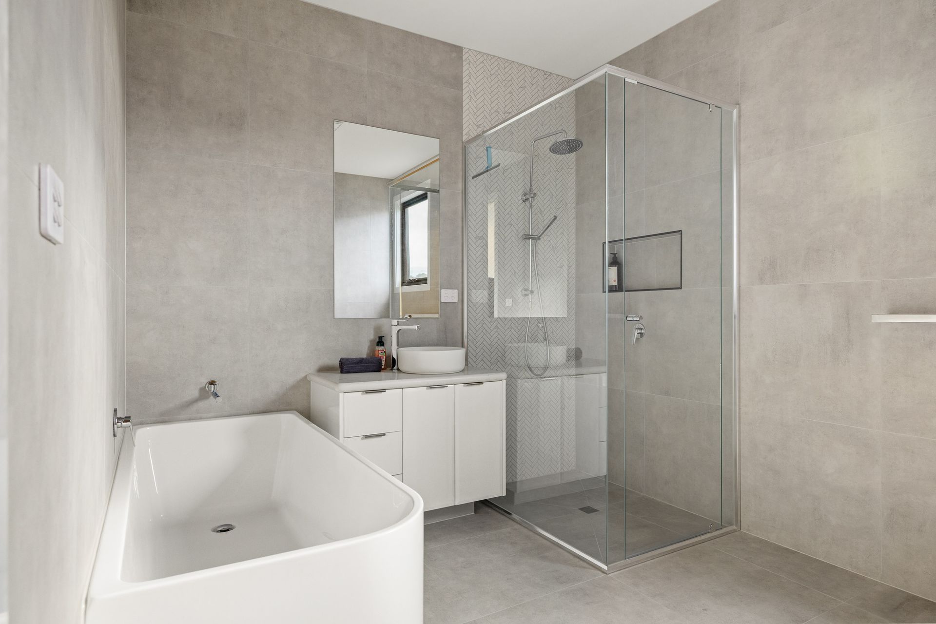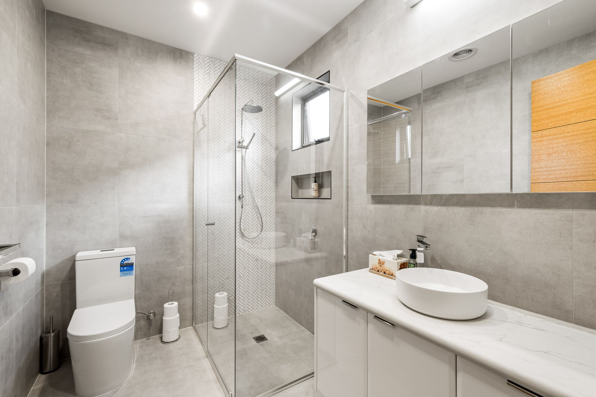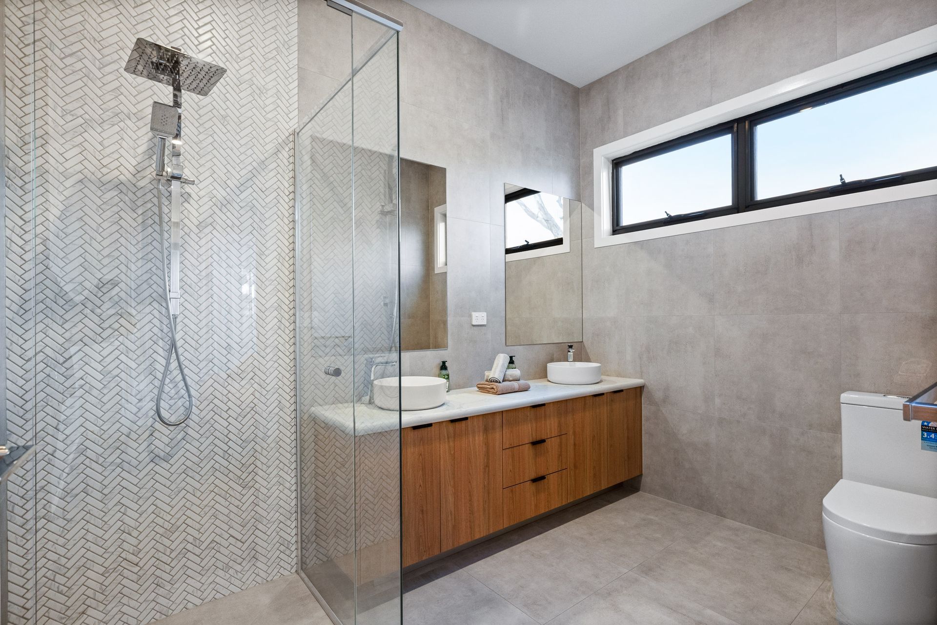 The large open plan Kitchen/Dining/Living Room (with 75" smart TV) flows out to the covered Alfresco and has internal access to the Garage. A central Hallway provides access to a Laundry (with washing machine), Bedroom 2 & 3 (each with BIR), a Bathroom (with shower, bath, toilet & heat lamps) and a separate Toilet. At the end of the hall is Bedroom 1, which features a WIR and ensuite (with shower, toilet double vanity & heat lamps).
