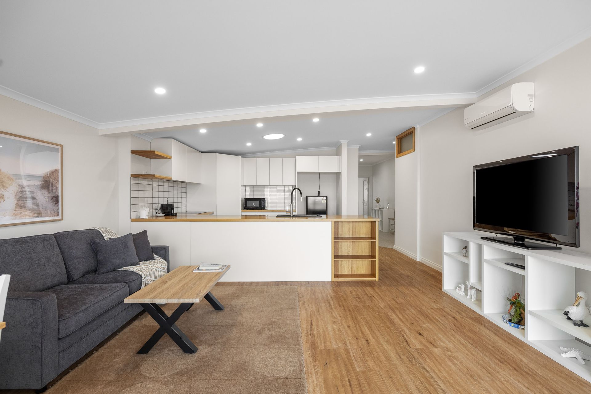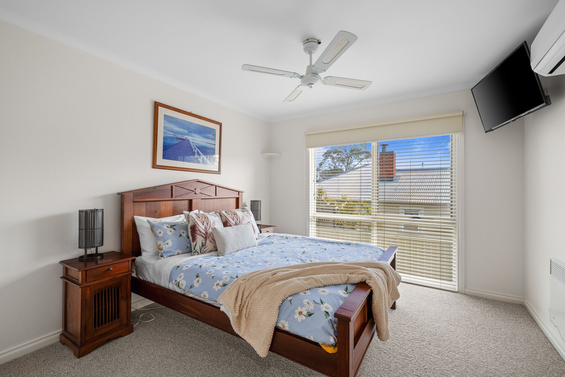 Downstairs there are a wall/ceiling mounted reverse cycle air conditioners in the Kitchen/Dining/Living room, 2nd Living Room and in all 3 three bedrooms, ceiling fans in Bedrooms 1 and 2, plus wall mounted electric heating in all 3 Bedrooms. Upstairs there are two wall mounted reverse cycle air conditioners in the apartment; one in the Kitchen/Dining/Living room and the other in the Bedroom.