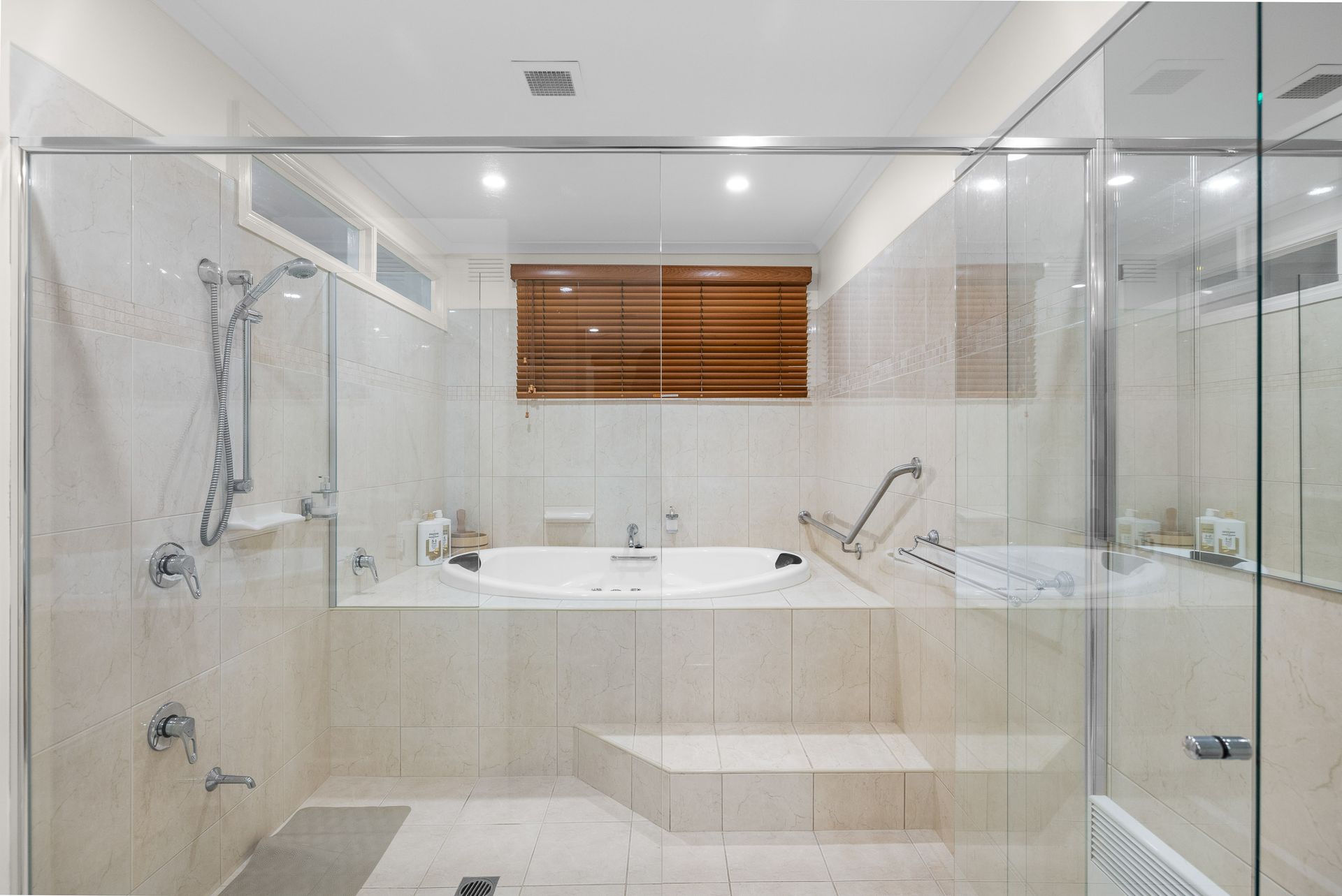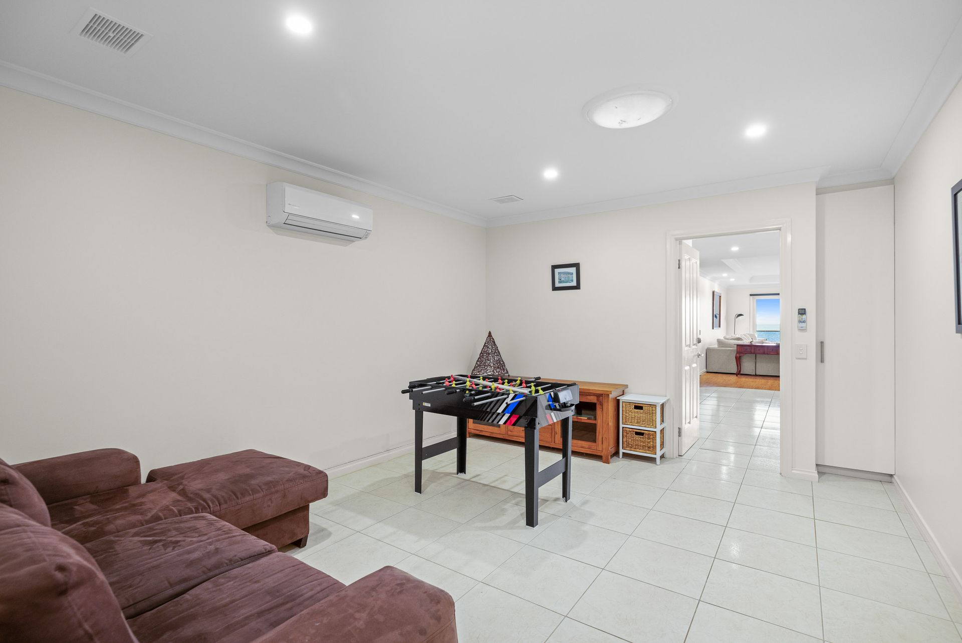 Downstairs, features a huge open plan Kitchen/Dining/Living Room (with 70" smart TV & DVD player with some DVDs) with stunning water views that flows through to the ocean-facing Terrace, has a separate Powder Room and provides access through to the second Living/Games Room (with 4 feet 4-In-1 Game table for kids with Fuzbol, Table tennis, Pool table & Air hockey, plus an assortment of board games & childrens books). A central hallway leads from there to Bedroom 1, which features a wall-mounted 42" smart TV & BIR, Bedroom 2, which features another wall-mounted 42" smart TV, BIR and a dual-entry ensuite (with spa-bath, shower, toilet & heated towel rails), Bedroom 3 with an an ensuite (with spa-bath, shower, toilet & heated towel rails) and a Laundry (with washing machine).