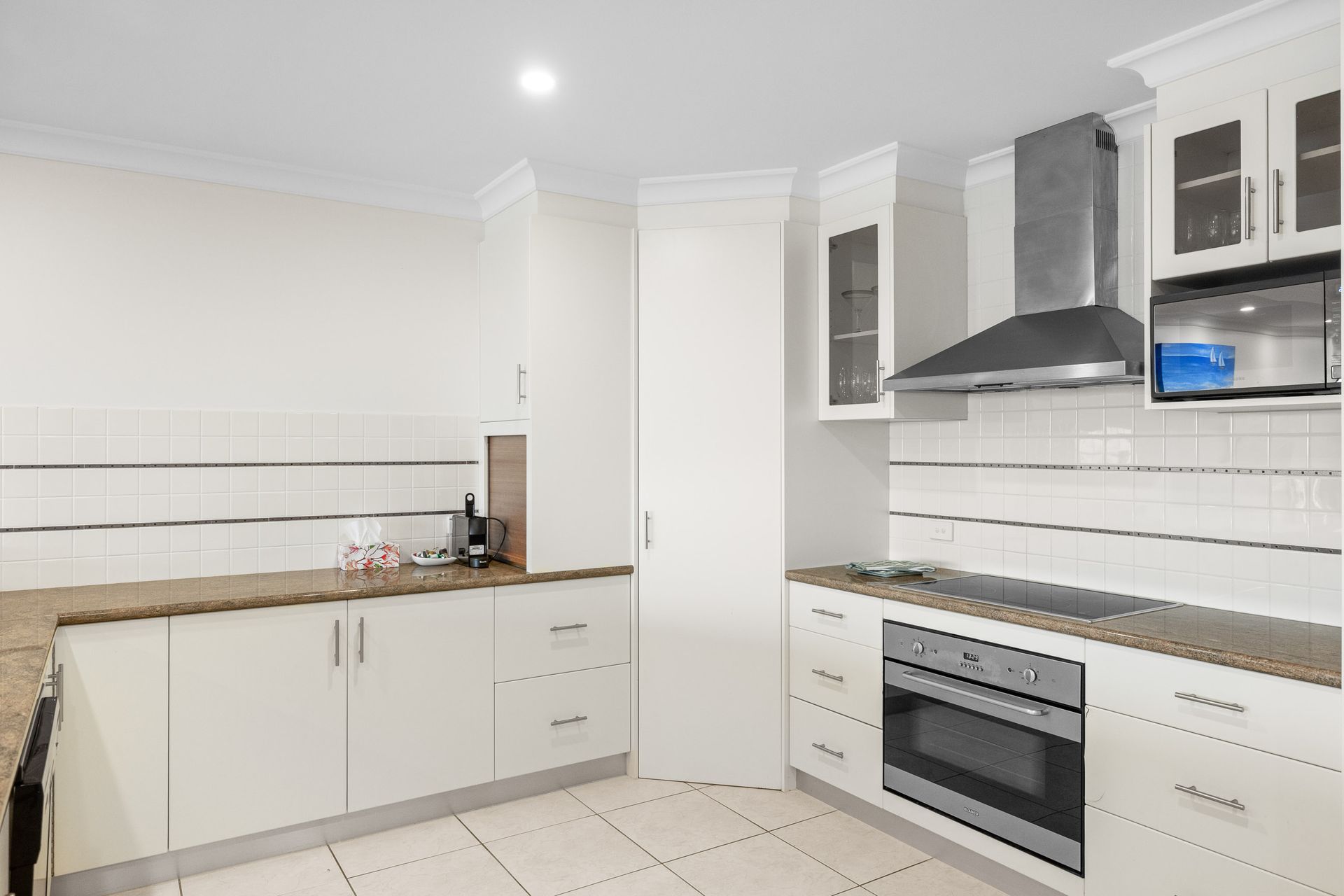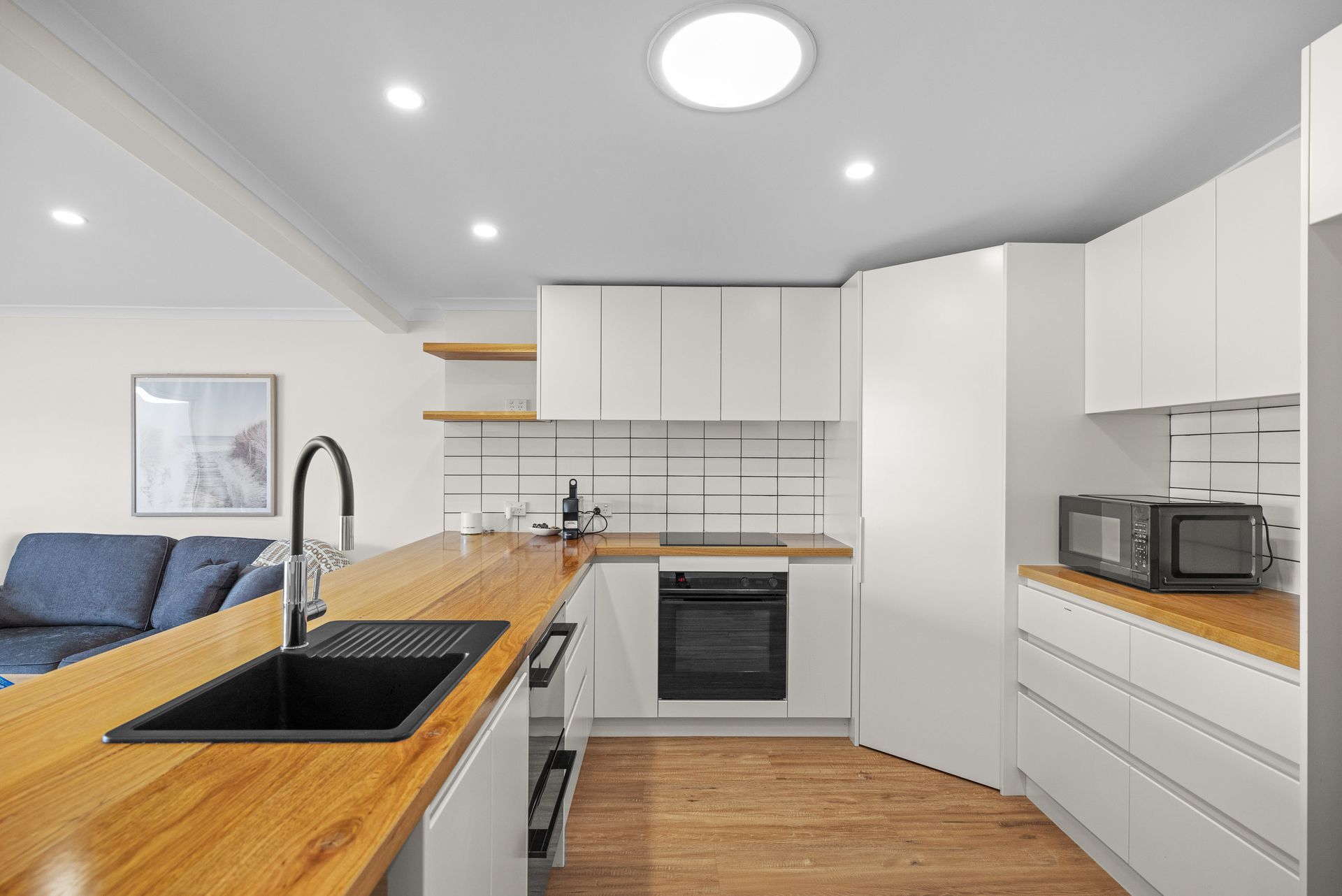 Downstairs, the fully appointed kitchen is equipped with cooking utensils, crockery, cutlery, microwave, Breville (Nespresso combatile) pod coffee machine, toaster, kettle, air fryer, sandwich maker, rice cooker/steamer, plus a double sink, fridge, dishwasher, electric oven and induction cook top. Upstairs is equipped with cooking utensils, crockery, cutlery, microwave, Breville (Nespresso combatile) pod coffee machine, toaster, kettle, air fryer, 30-bottle wine fridge, plus a sink, fridge, dishwasher, electric oven and induction cook top.