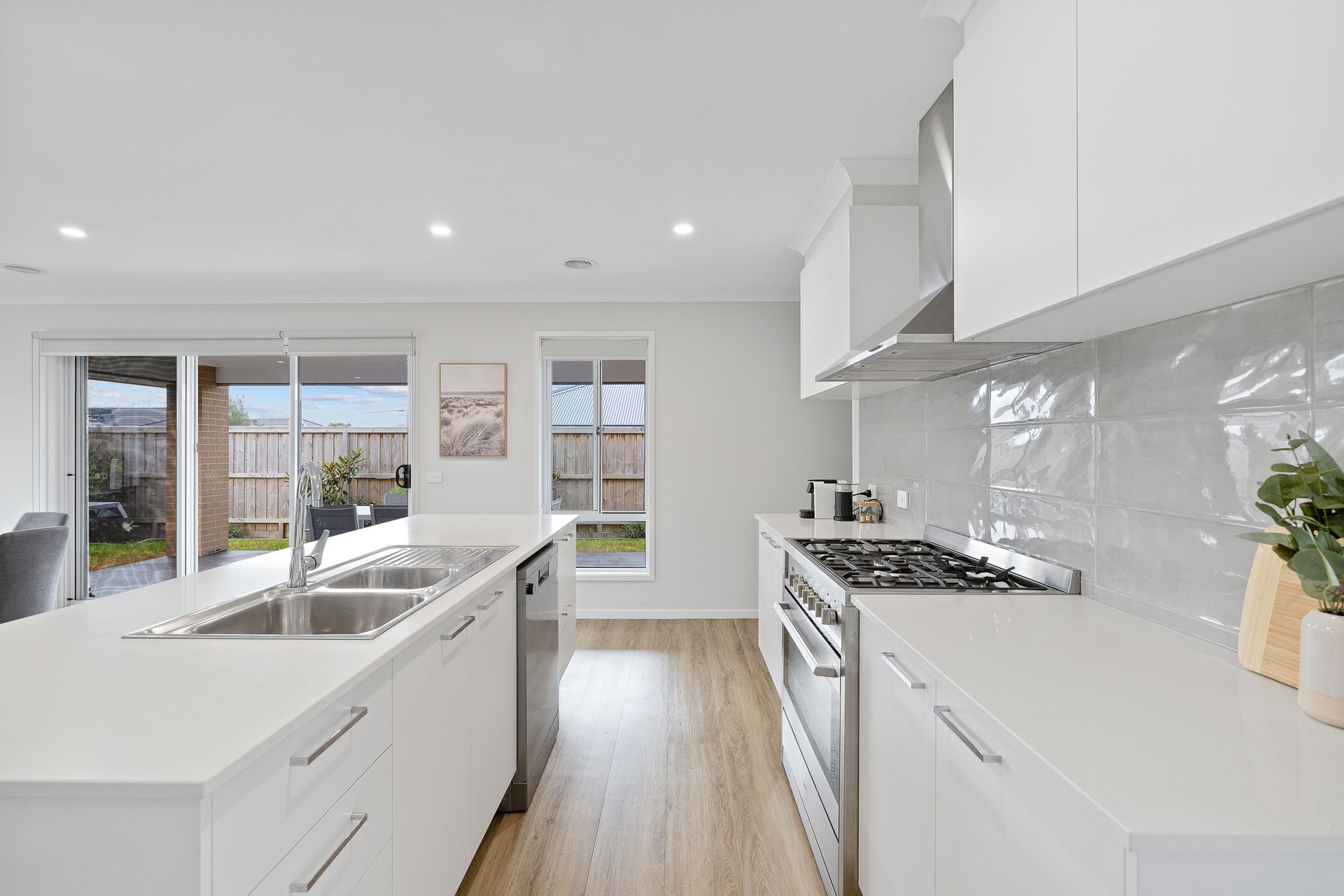 The fully appointed kitchen is equipped with cooking utensils, crockery, cutlery, microwave, Nespresso pod coffee machine with frother, toaster, kettle, etc. plus a double sink, fridge, dishwasher, 900mm electric oven and 5-burner gas cook top.