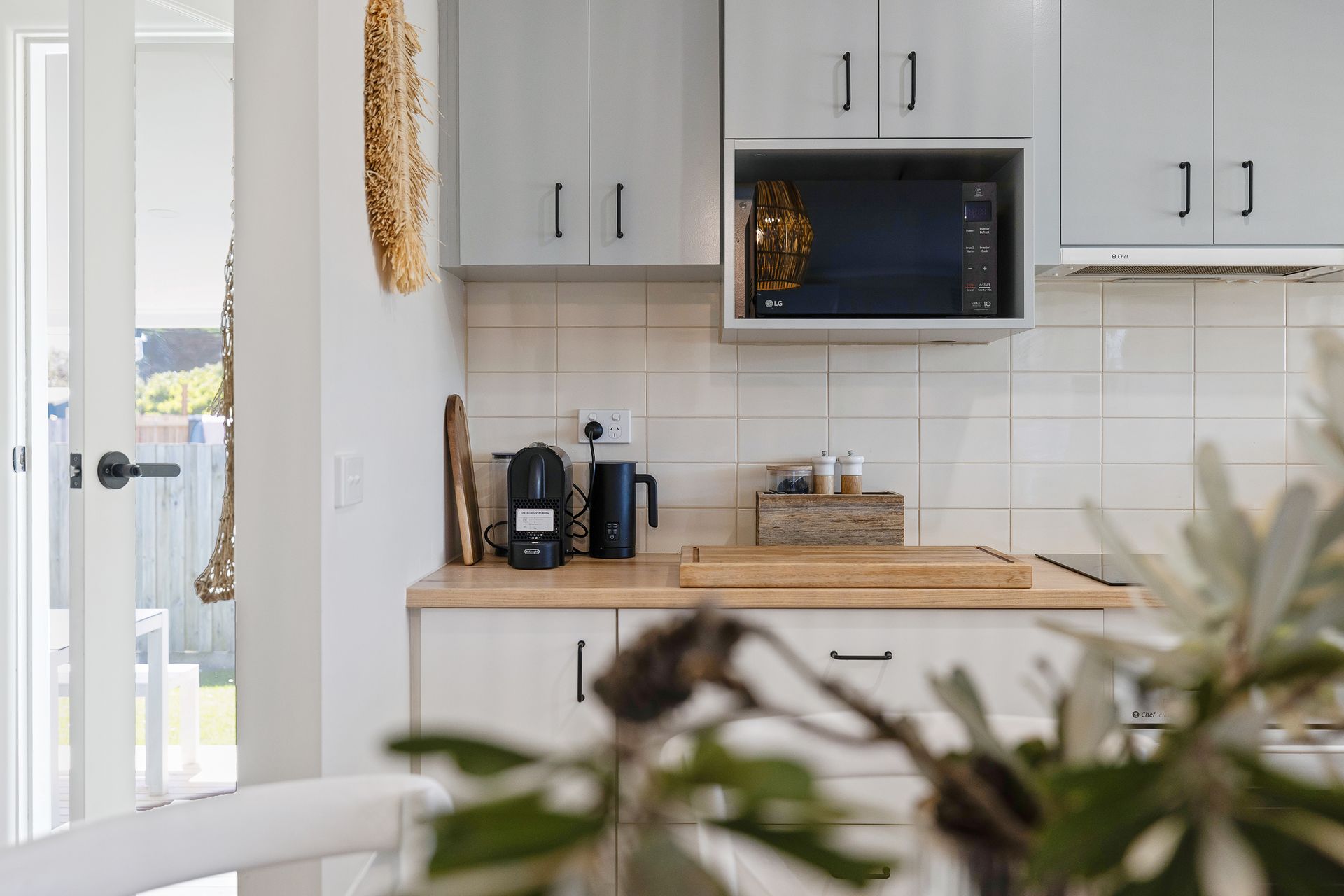 The fully appointed kitchen is equipped with cooking utensils, crockery, cutlery, microwave, Nespresso pod coffee machine with frother, toaster, kettle, etc. plus a double sink, fridge, electric oven and cook top.