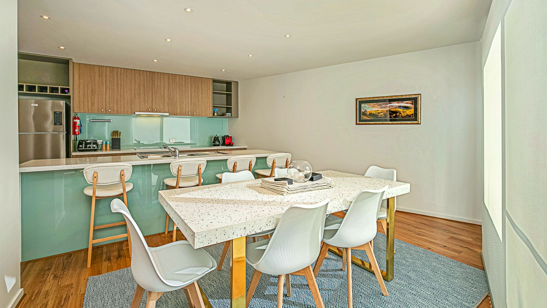 The fully appointed kitchen is equipped with cooking utensils, crockery, cutlery, microwave, coffee machine (Nespresso pod), toaster, kettle, etc. plus a sink, large fridge, dishwasher, oven and cook top.