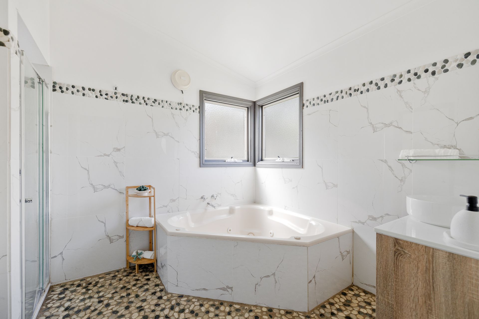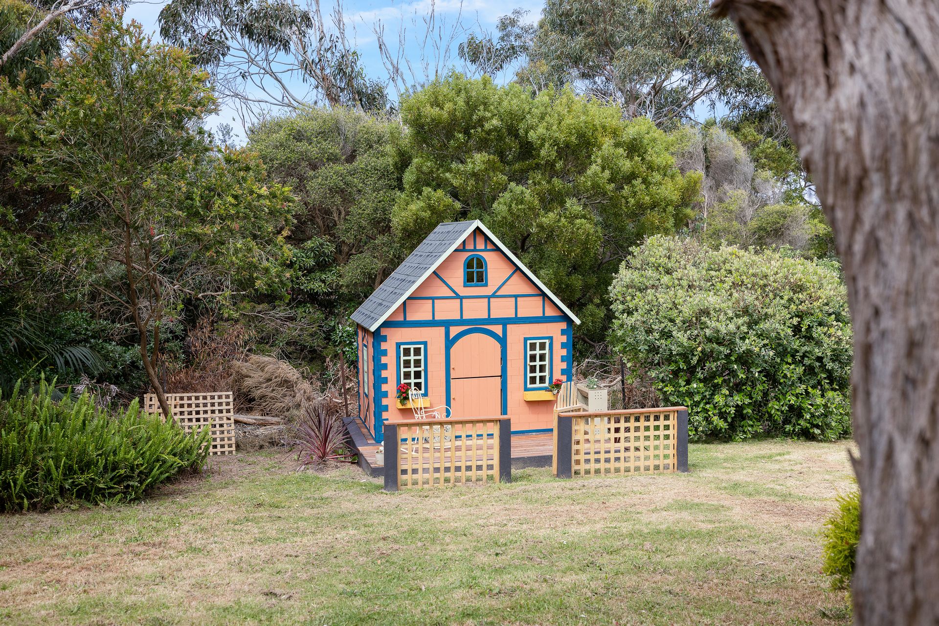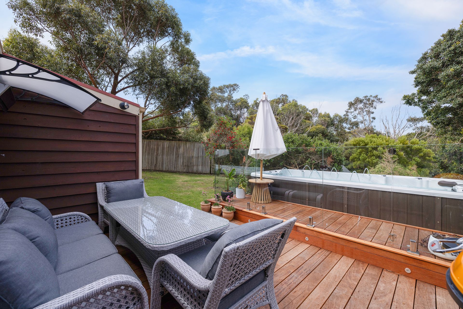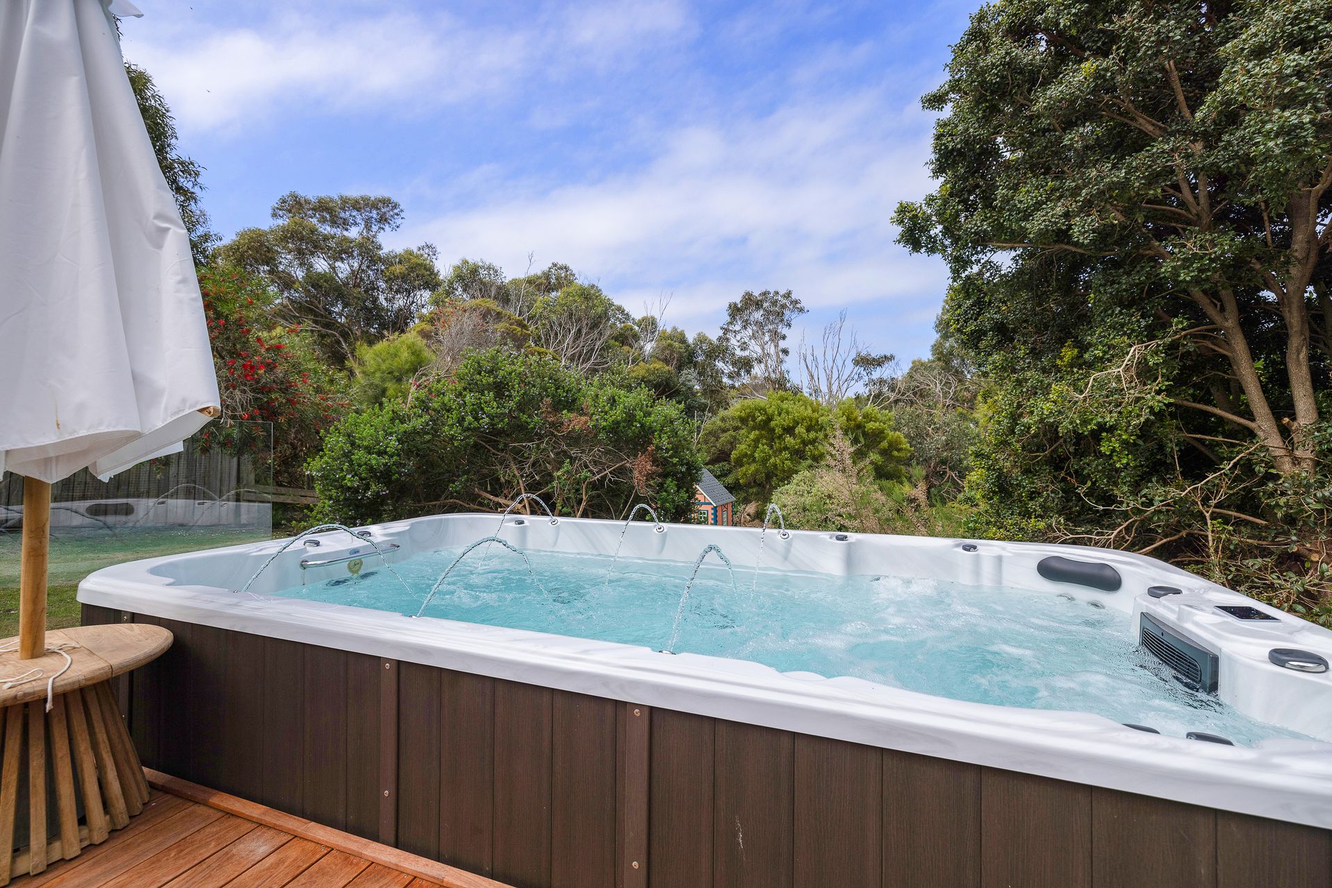 The covered Verandah at the rear of the home features the incredible electric heated 6-seater swim spa plus swim zone (4.3m x 2.3m, 1.3m deep). Also on the Verandah is seating and a table for 9 people, an umbrella (for the spa), a gas BBQ and a wall-mounted electric heater. There is also a large Alfresco area off the Dining Room and a Patio on the front of the home. There is space to park one car in the left side of the double Garage, which also features a fuzbol table and some boogie boards. Additional parking for up to 2 vehicles (cars and/or a boat) is available on the driveway. Pets are welcome at the home but guests should be aware the block is not fenced nor fully secure. There is a cubby house that is perfect for children in the back yard.