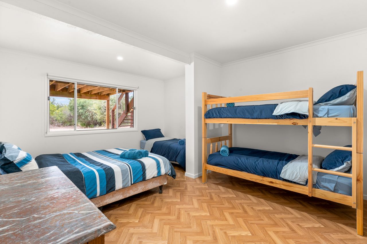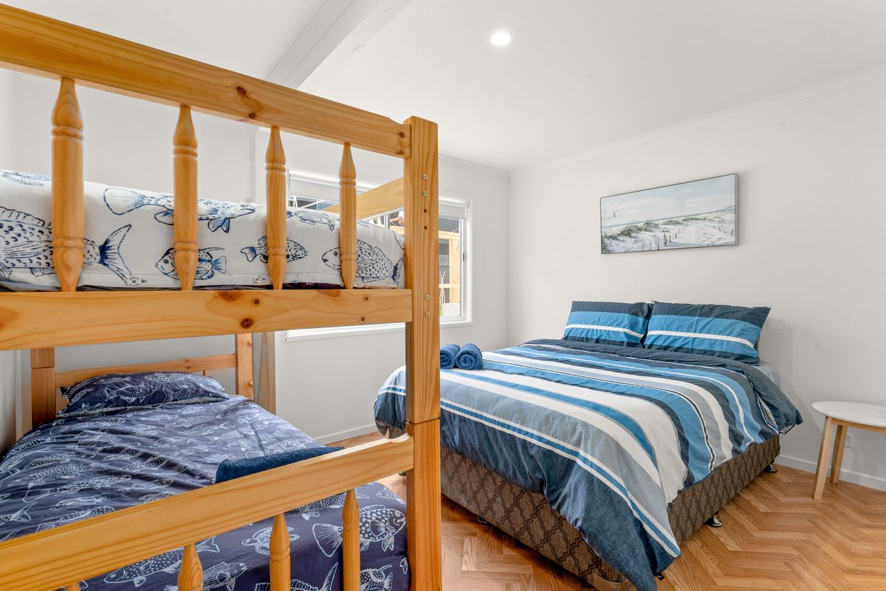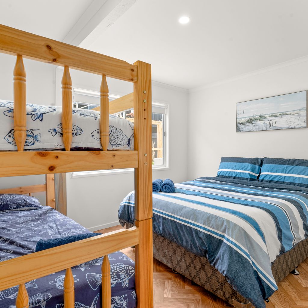 Bedroom 2 (Downstairs): One Queen bed, one Set of Single bunks and one Single bed