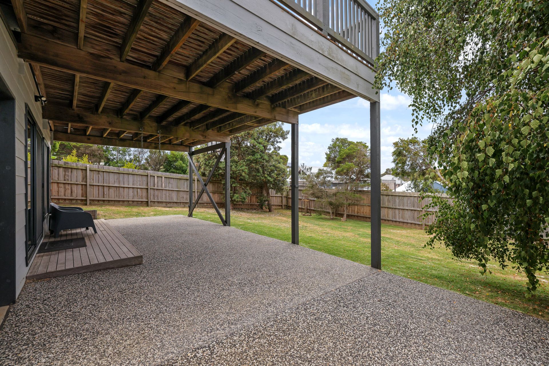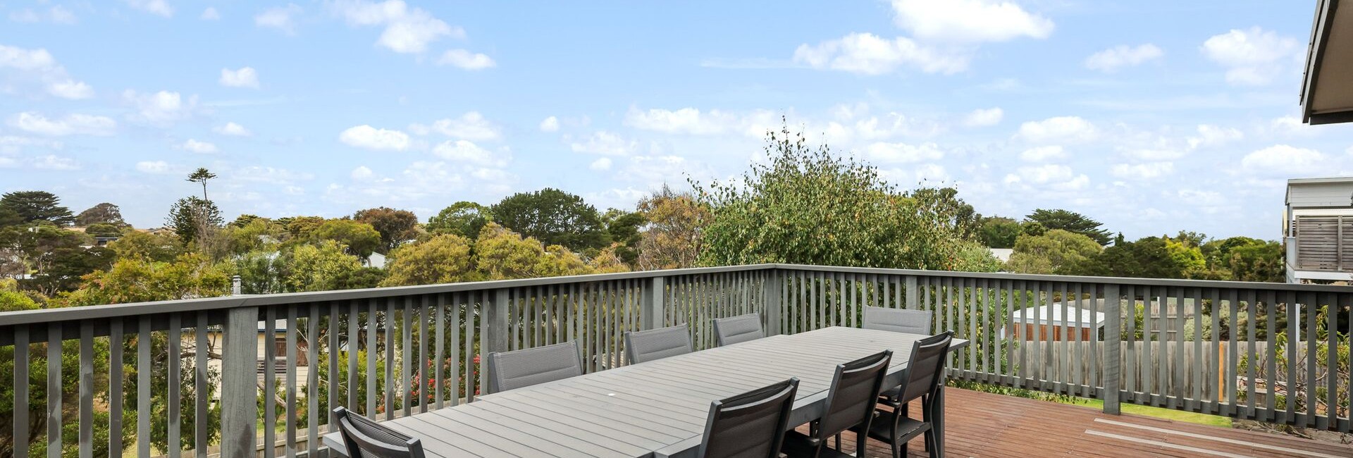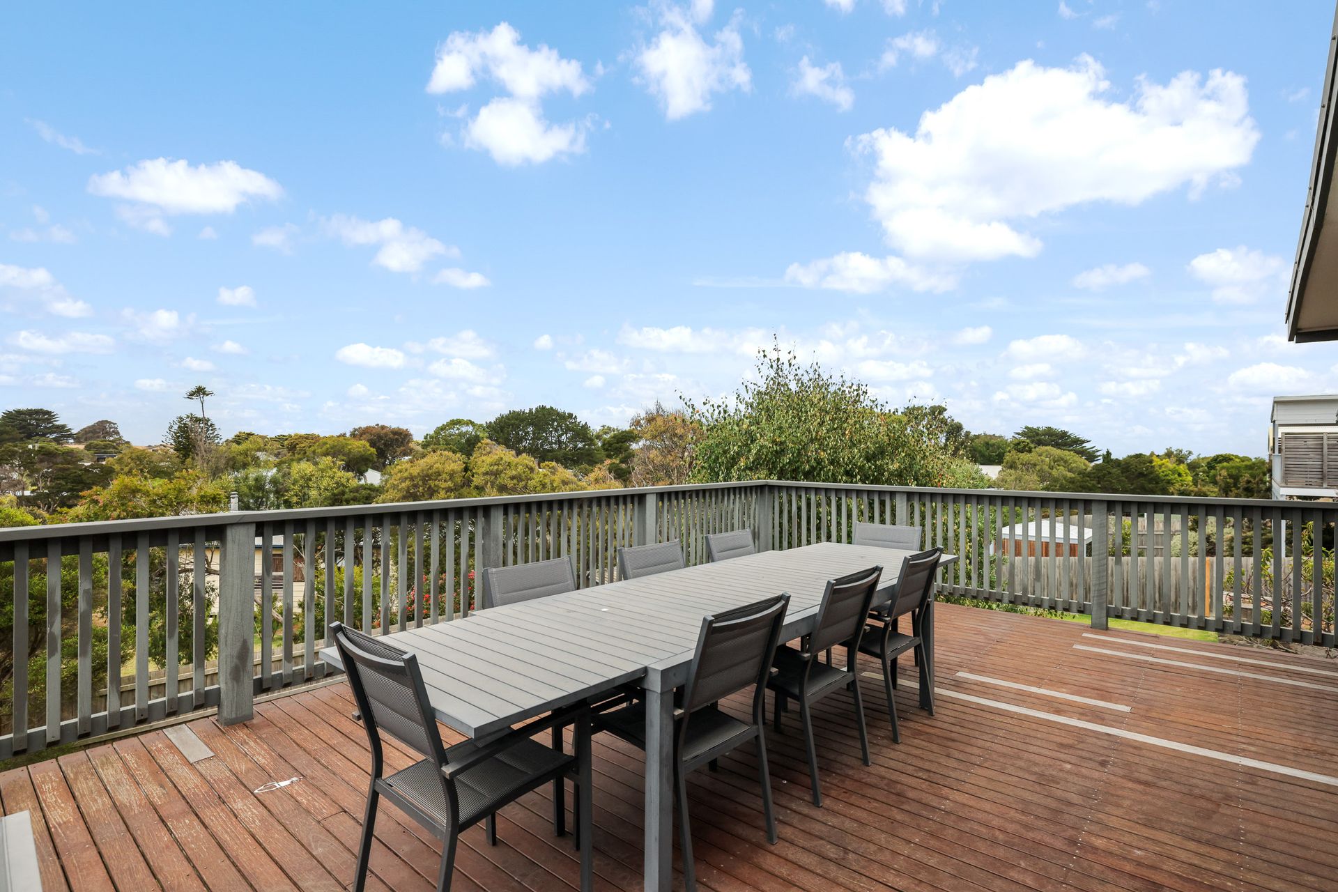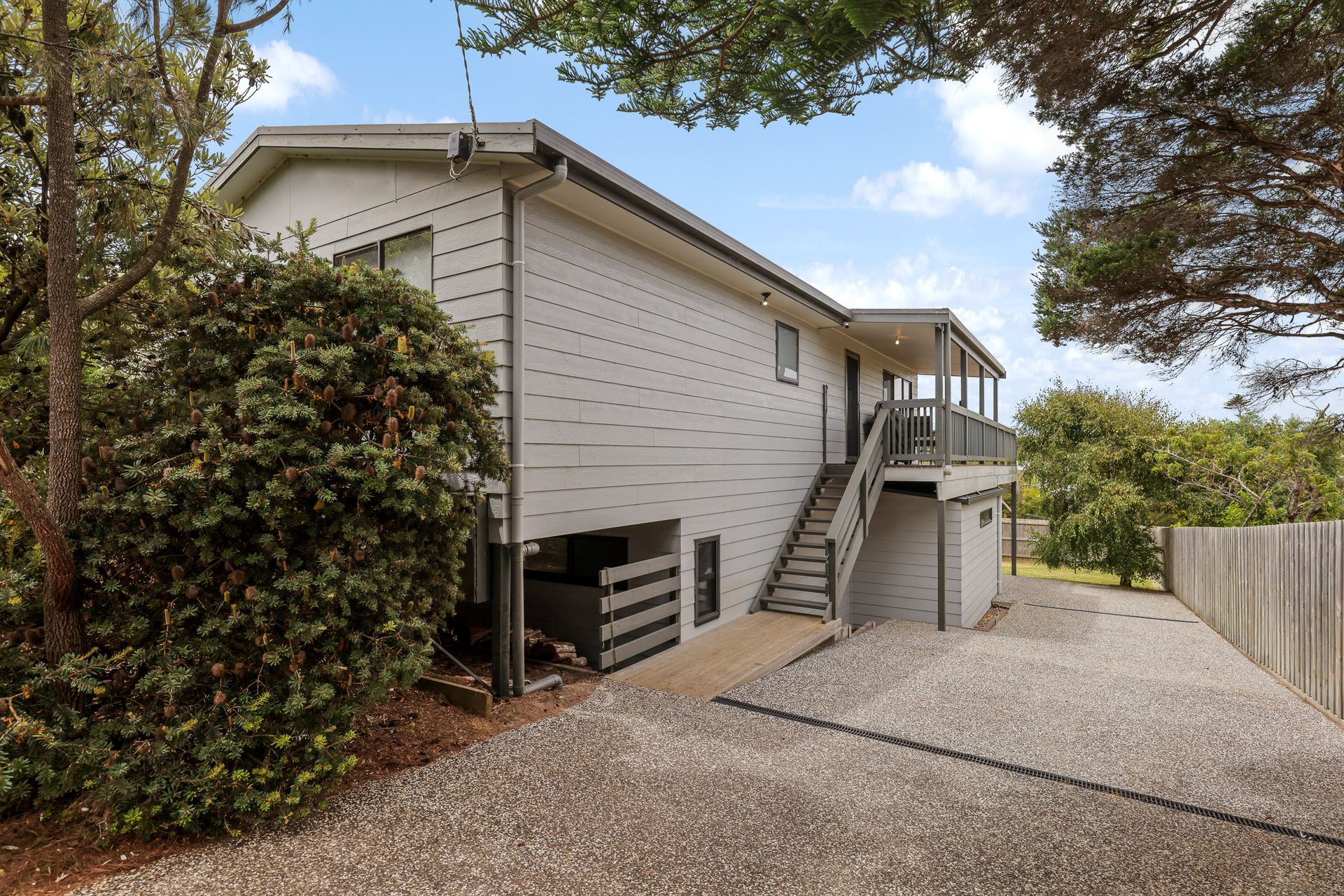 The large first-floor Balcony (with gas BBQ, outdoor dining table with seating for 12 and two sun lounge chairs) extends directly off the open-plan Living area and provides a wonderful space to relax, dine, or enjoy the fresh coastal air and leafy surroundings. Wrapping around the side of the home is a covered verandah-style deck, offering an additional sheltered outdoor space ideal for quiet moments or casual entertaining.