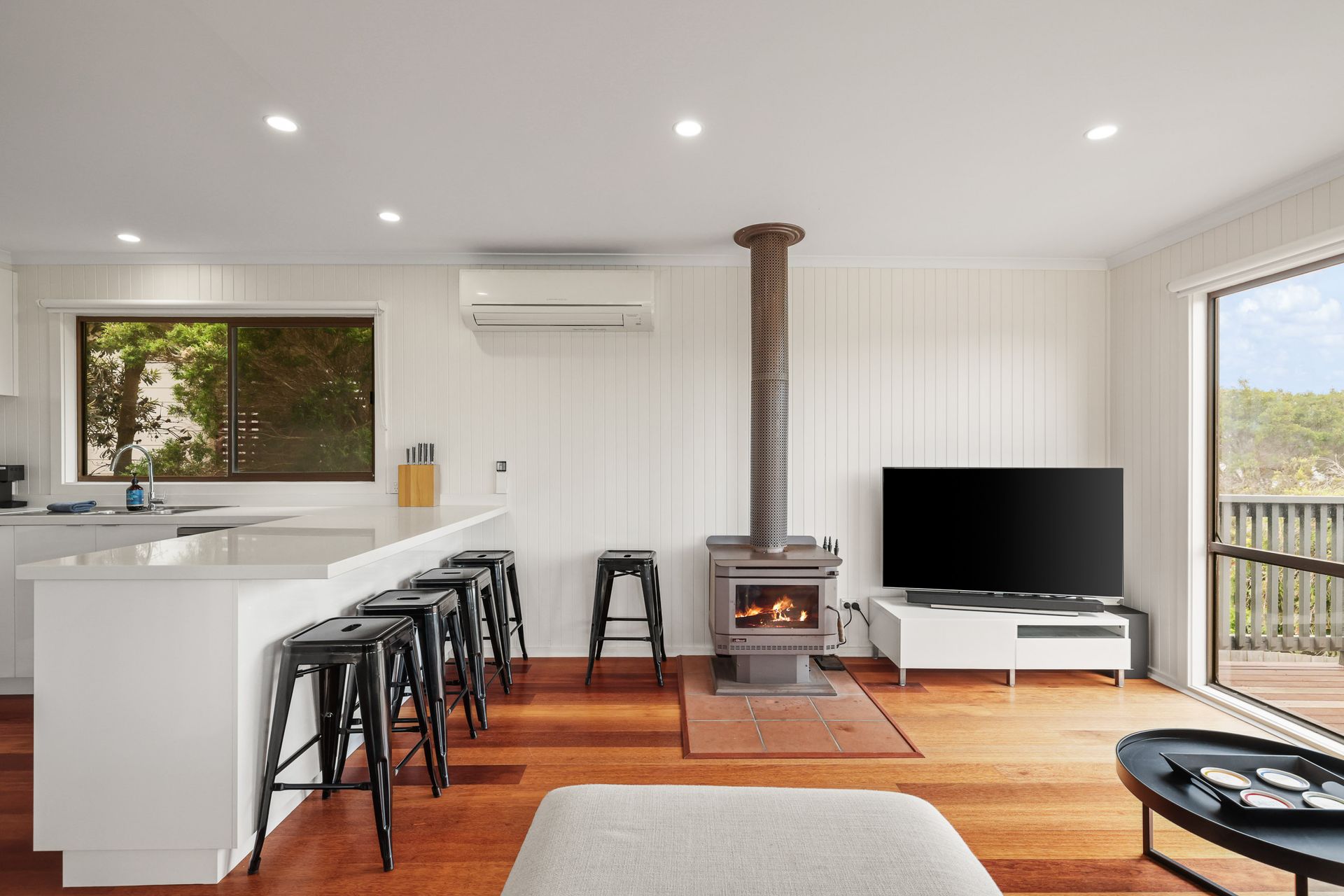 There are two wall-mounted reverse-cycle air conditioners in the home; one in the upstairs Kitchen/Dining/Living room and the other in the downstairs Living/Games Room. The home has a Coonara-style wood heater (some wood provided to get you started) in the upstairs Dining/Living Room.
