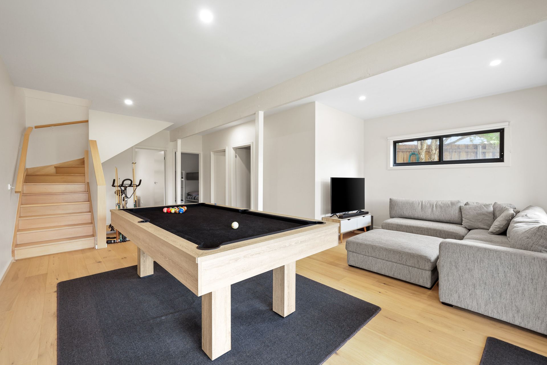Accessible via internal or external stairs, the ground floor features a fantastic, comfortable second Living Area (with pool table and 55" Smart TV), ideal as a kids’ zone and games room. Also on this level are Bedroom 2 and Bedroom 3 (each with BIR). A main Bathroom (with shower & toilet) and another separate Toilet.