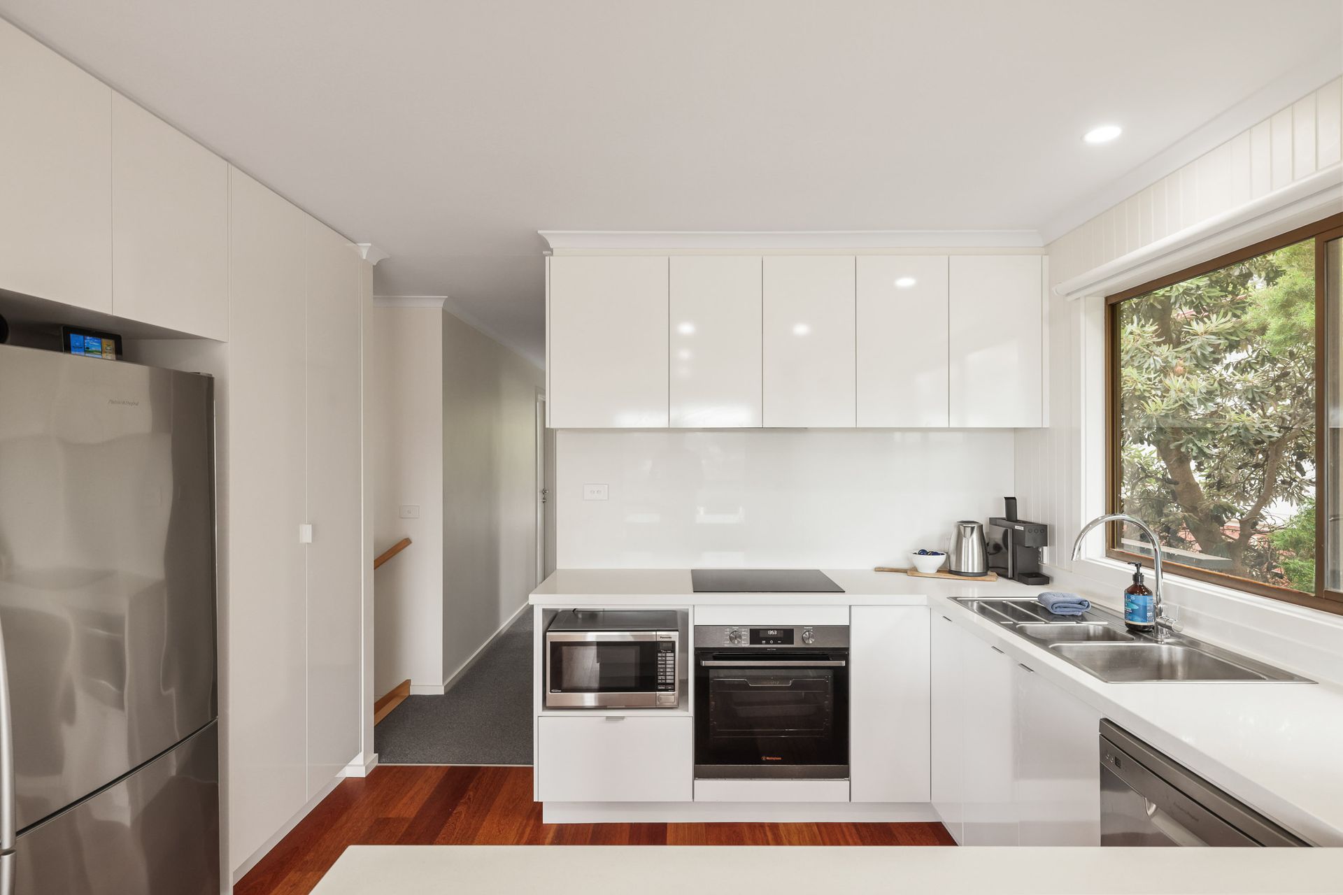 The fully appointed kitchen is equipped with cooking utensils, crockery, cutlery, a microwave, an Aldi coffee pod machine, a toaster, a kettle, etc. plus a double sink, a fridge, a dishwasher, an electric oven and an induction cooktop.