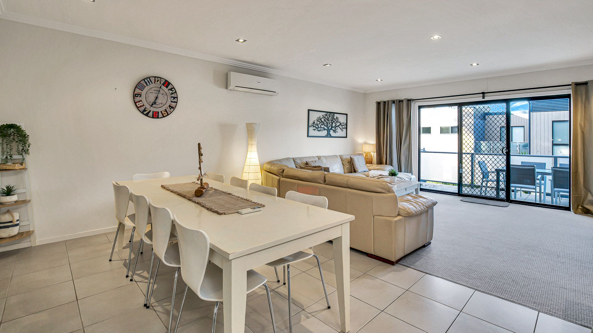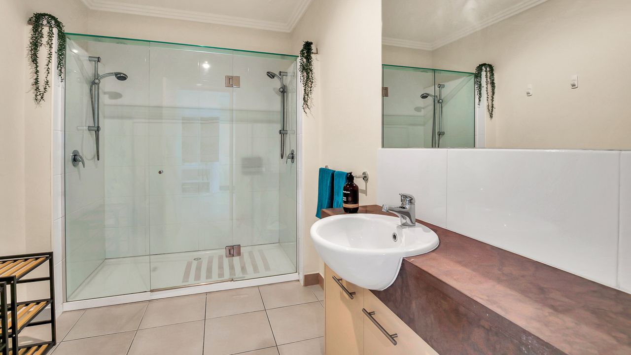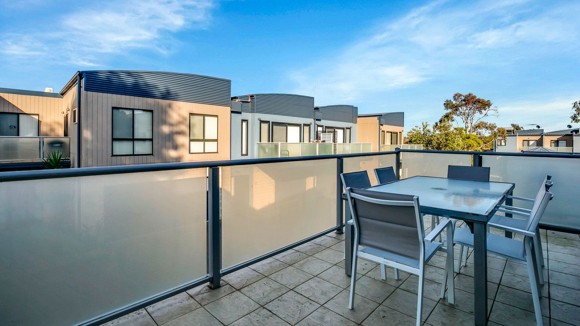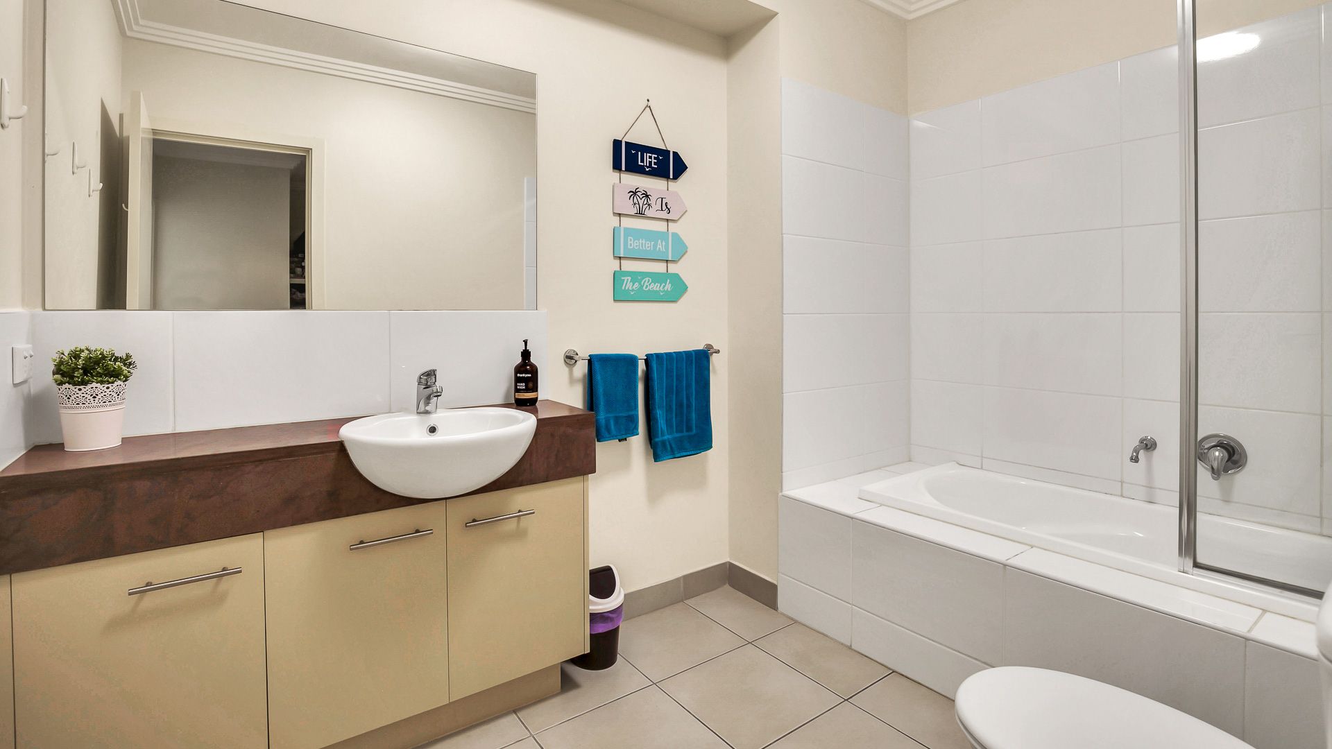 Upstairs is the large open plan kitchen, dining/living room (with a 75 inch smart TV) which provides access to the upstairs front balcony. Bedrooms 1 and 2 are also upstairs, each with a BIR and another bathroom (with shower and toilet).
