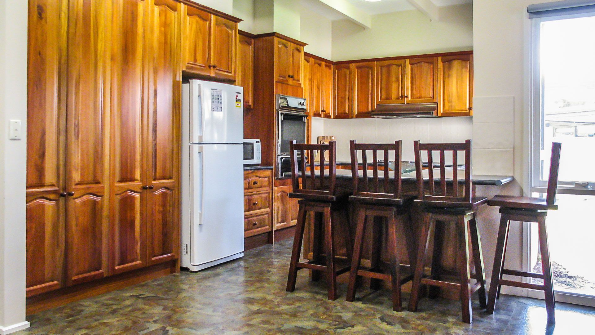 This single-storey home (with 3-4 stairs to access the front door) has a large open-plan Kitchen/Dining/Living room (with two plasma TV’s, both with DVD players and a coonara-style wood heater), leading onto a shady outdoor Deck area. There are five spacious bedrooms; the master has a WIR and an en-suite (with shower and toilet) and two other Batnrooms (each with a shower & toilet), plus a fully equipped Laundry (with washing machine and clothes dryer).