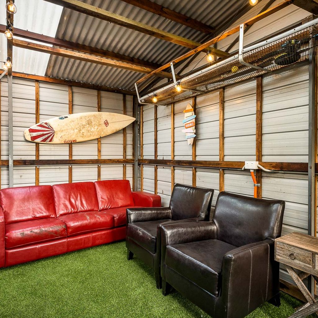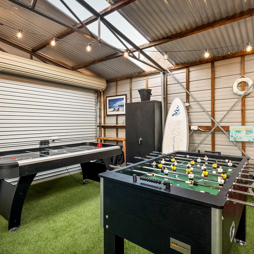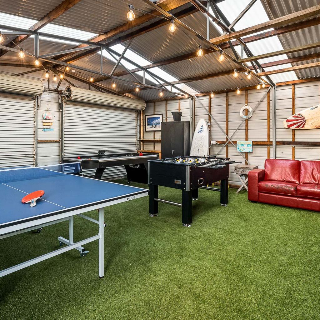 The double garage has been converted into a games room, complete with table tennis, foosball, air hockey, darts, sofa and coffee table.