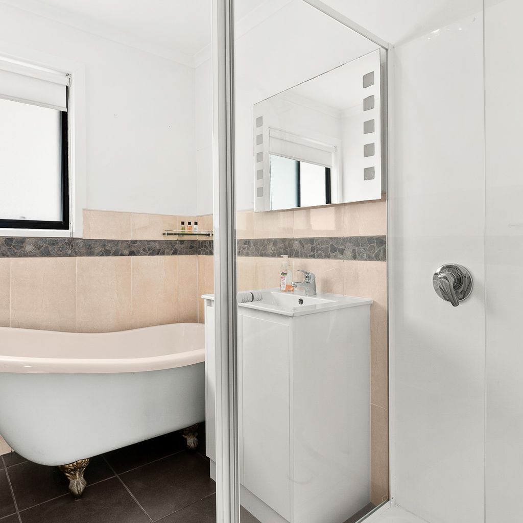 Downstairs you will find the open plan living with a sizeable kitchen, dining, and living area (with TV and Chromecast). Bedrooms 2 and 3 are downstairs, along with the laundry (including a second refrigerator), main bathroom (with free-standing bath & shower), and a separate toilet.
