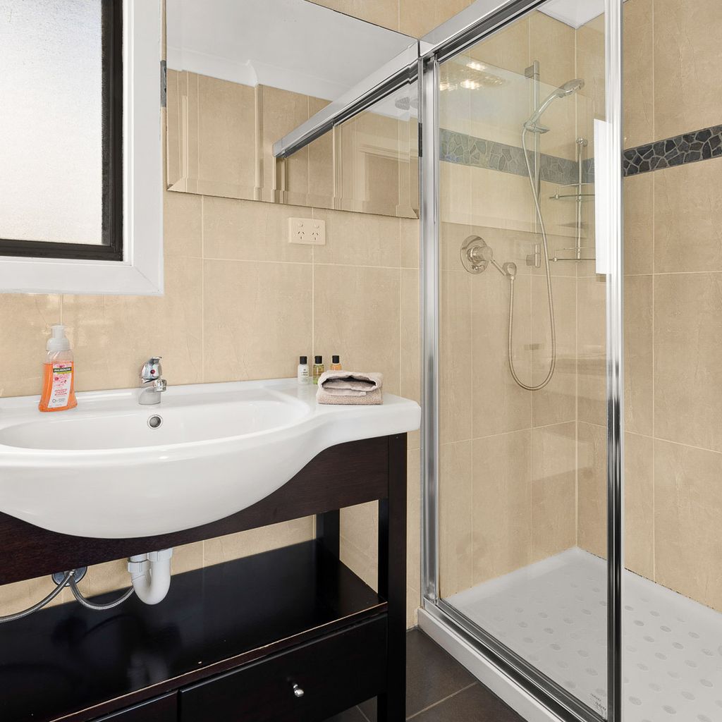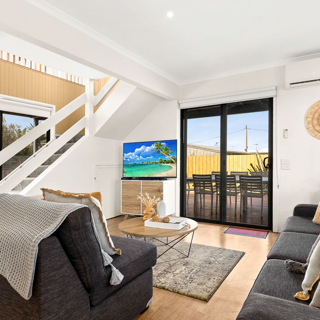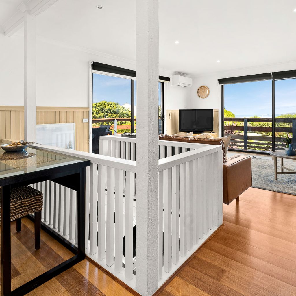 Upstairs is the master bedroom, complete with en-suite (including rain shower head and toilet), walk-through robe, and private side balcony. There is also a second living area (with new smart 50" TV and Chromecast) which seamlessly opens out onto a large balcony with scenic views.