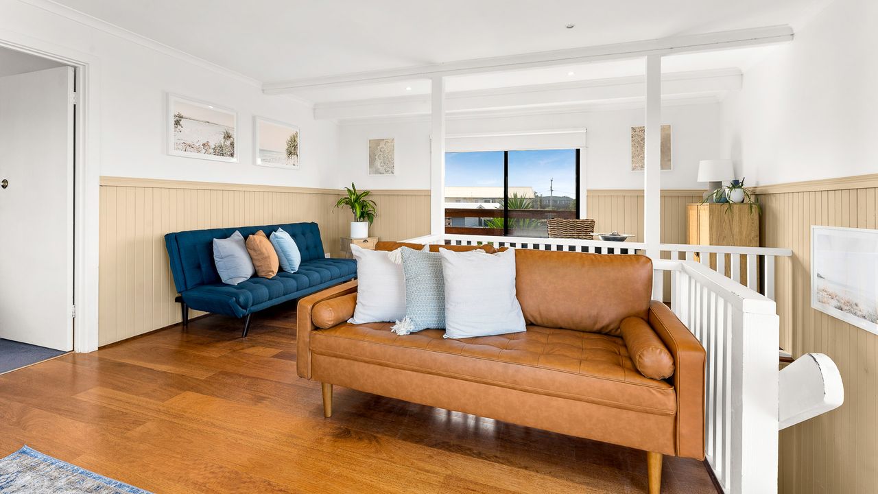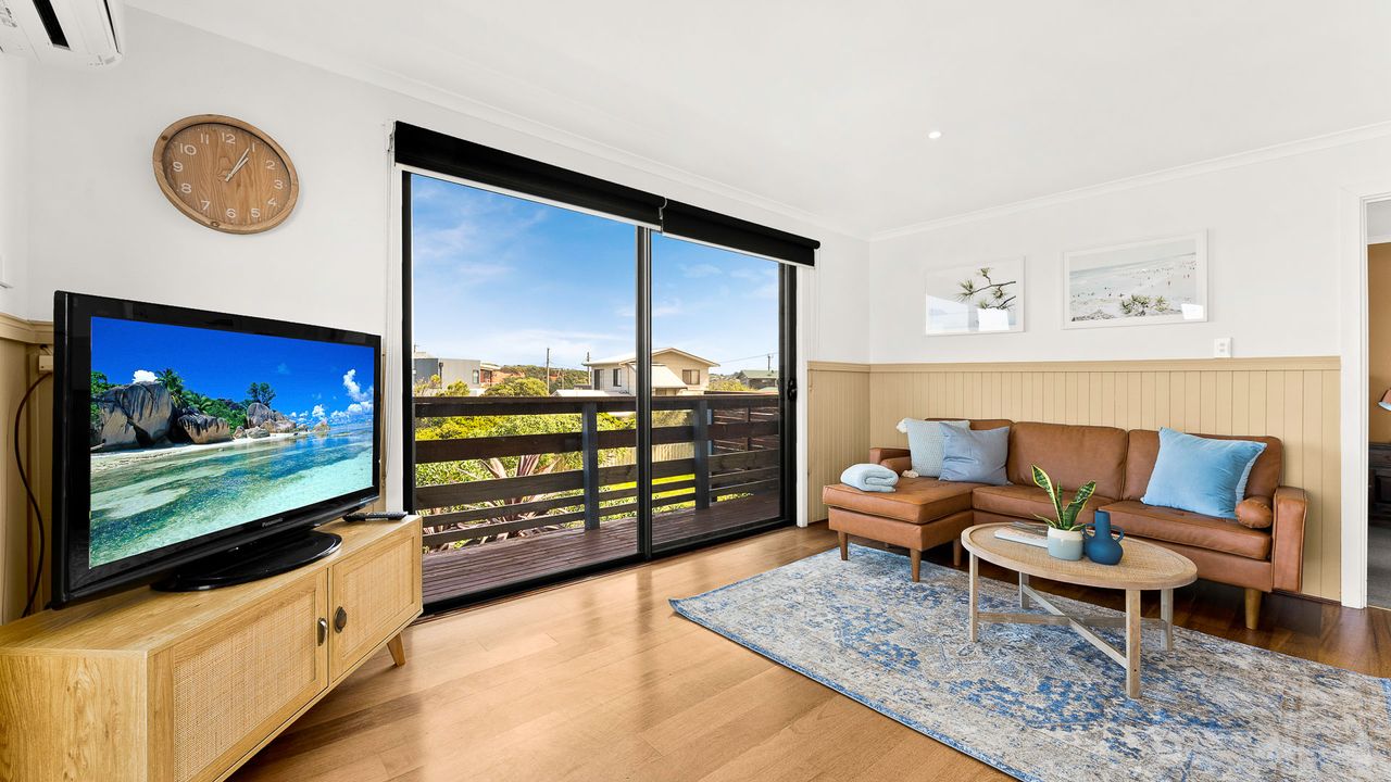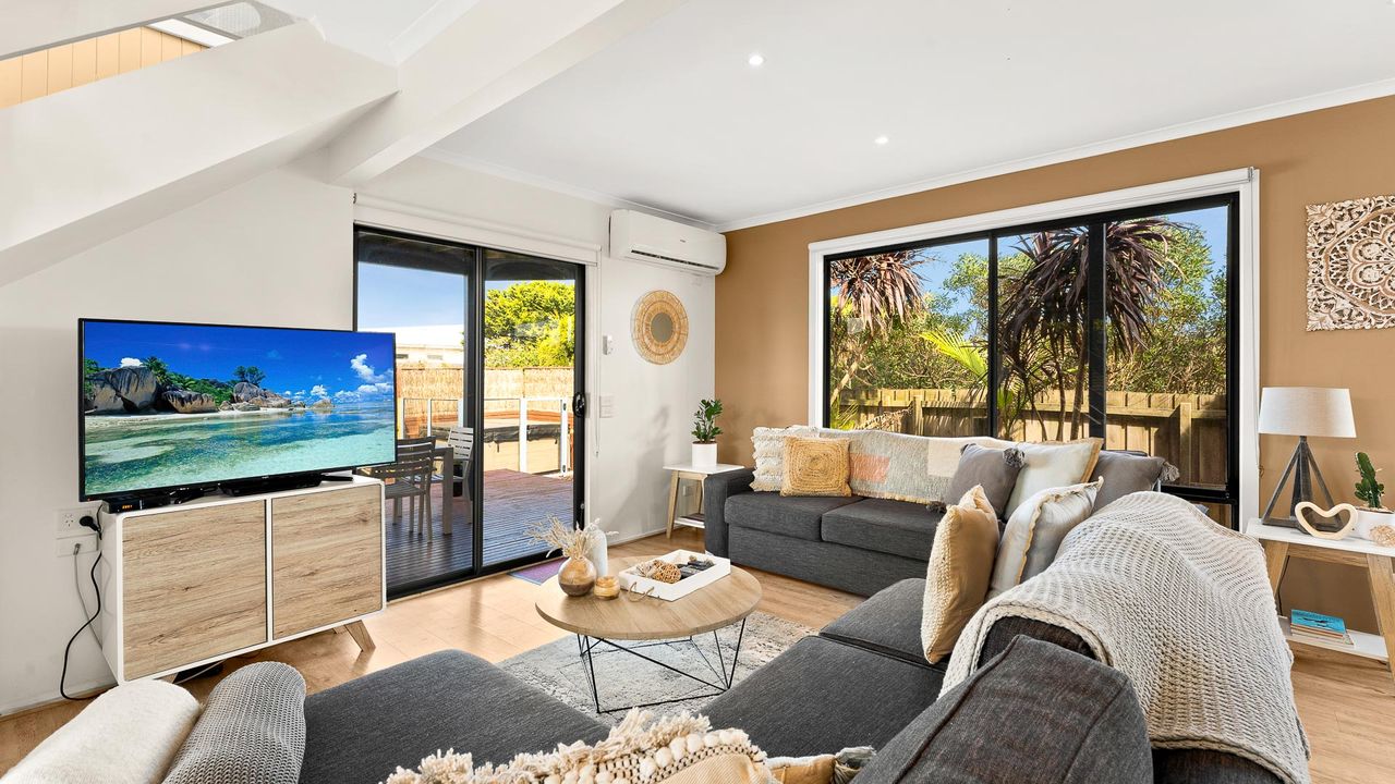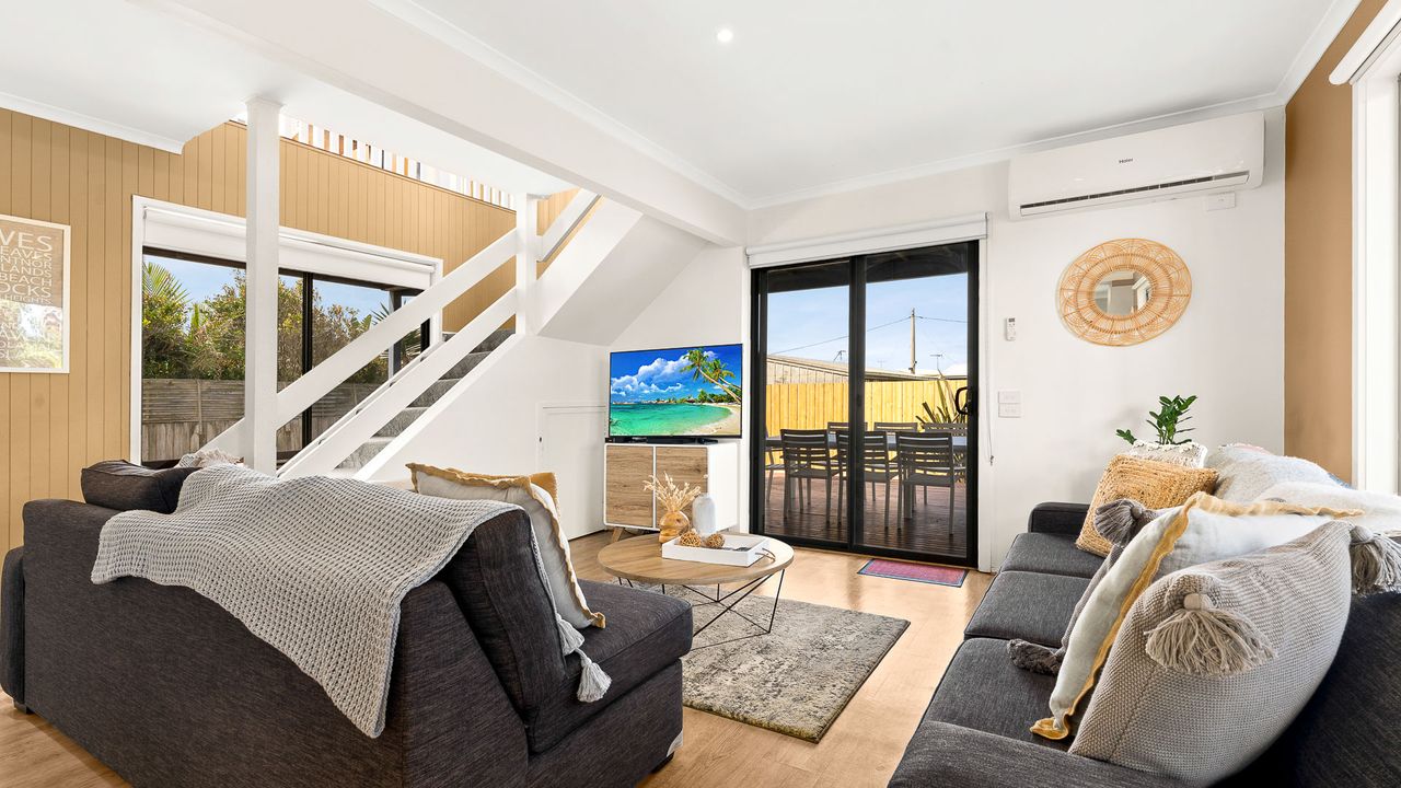 Upstairs is the master bedroom, complete with en-suite (including rain shower head and toilet), walk-through robe, and private side balcony. There is also a second living area (with new smart 50" TV and Chromecast) which seamlessly opens out onto a large balcony with scenic views.
