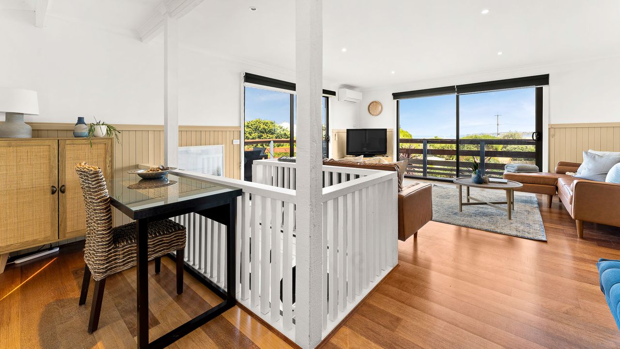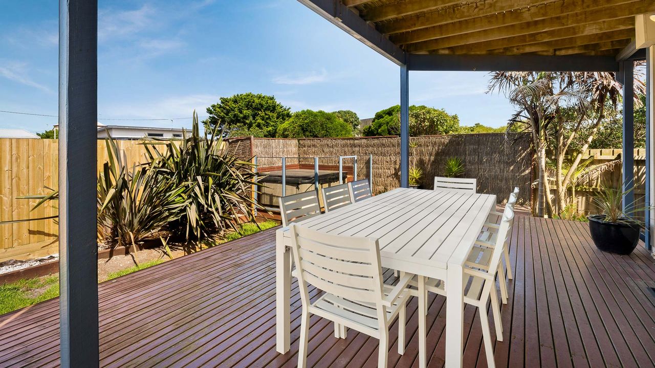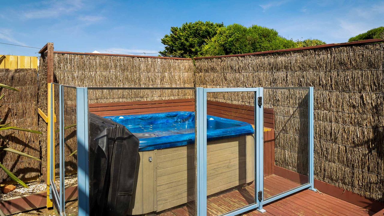 The lovely upstairs balcony with seating for up to 8 people provides water views over Sunderland Bay to Pyramid Rock, and there is a downstairs covered deck area (with BBQ and more seating for up to 8 people). The electric heated 6 person spa (with moderate jet functionality as of March 2024) and the fully enclosed rear yard, complete with a hammock, provides an amazing opportunity to relax in style.