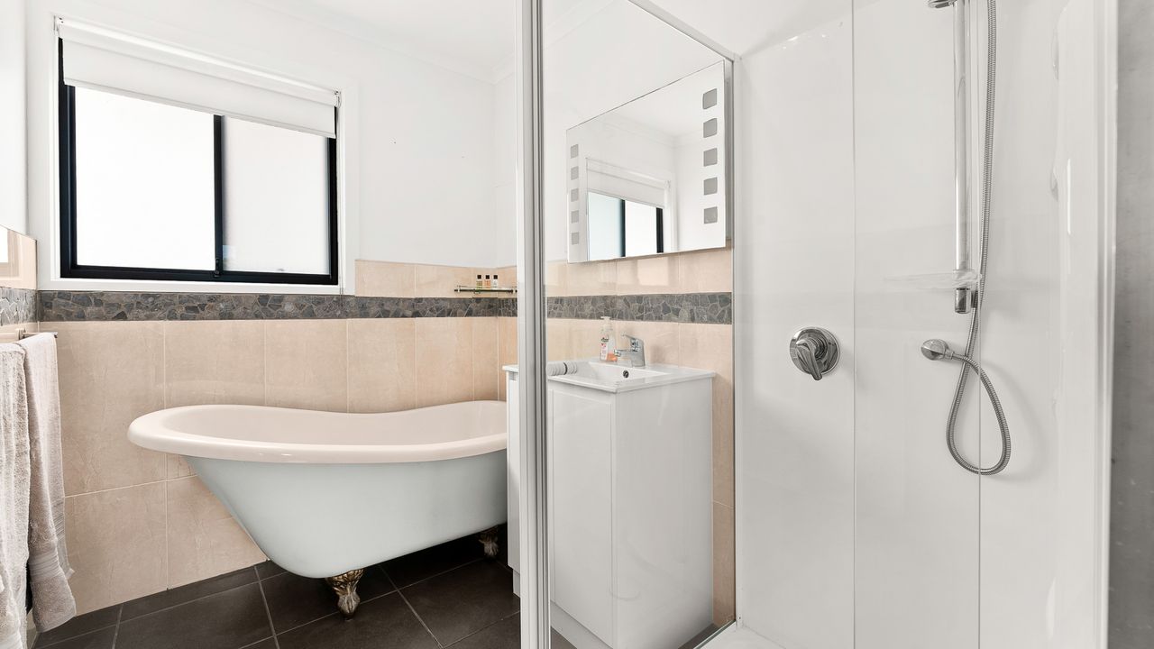 Downstairs you will find the open plan living with a sizeable kitchen, dining, and living area (with TV and Chromecast). Bedrooms 2 and 3 are downstairs, along with the laundry (including a second refrigerator), main bathroom (with free-standing bath & shower), and a separate toilet.