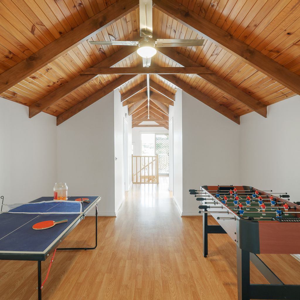 Upstairs is a Games Room (with mini Table Tennis table & Fuzbol table), Bedrooms 2 and 3 (each with BIR), access to the rear Balcony and the enormous Bedroom 1 with an attached Retreat, WIR and ensuite (with shower, toilet & double vanity).