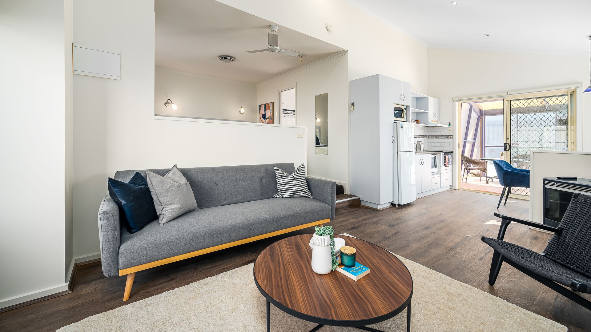 The bedroom has a built in robe and access to the bathroom (with spa bath/shower above & a toilet) . The central living room (with tv & gas fireplace) flows into the kitchen/dining area.