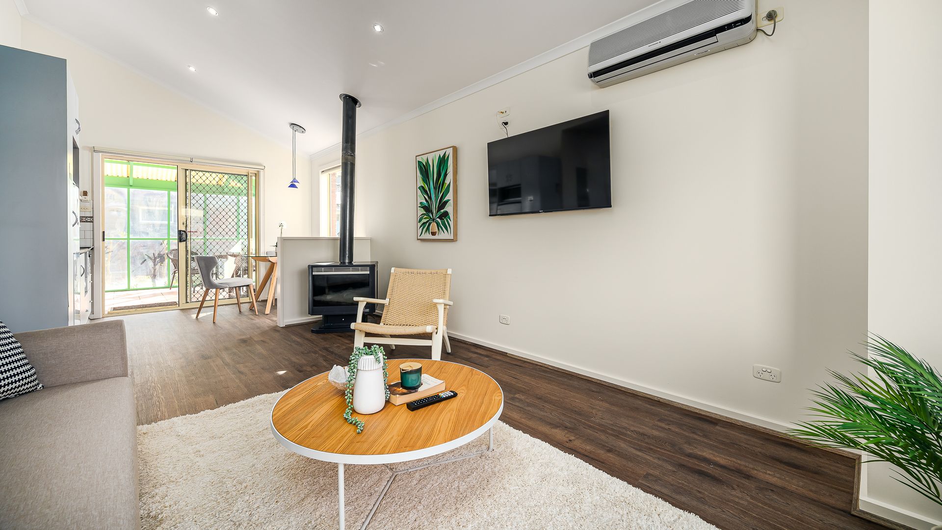 The Villa has a wall mounted air-conditioning unit (cooling only) in the living room, plus a gas fireplace. There is an electric blanket on the Queen bed.