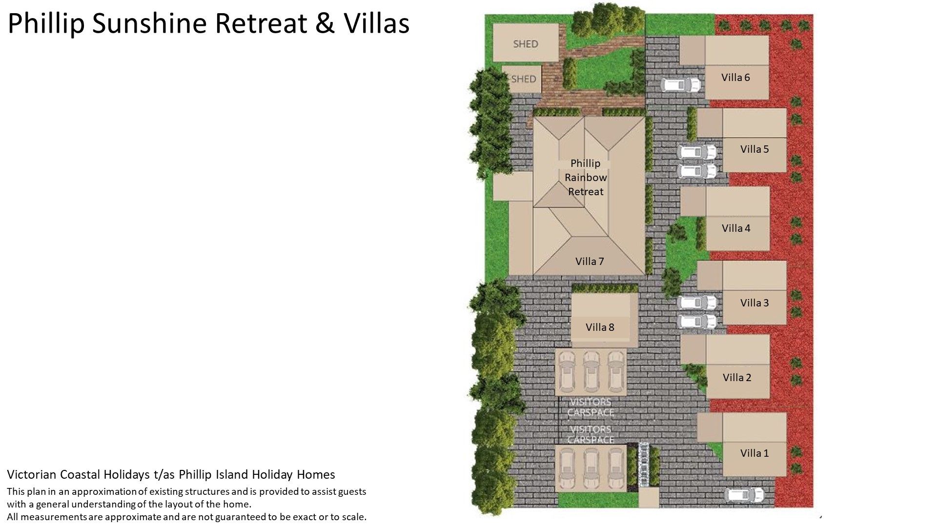 The Villa is situated on the same block as 7 other separate one-bedroom Villas and a larger home, previously known as "Cottages for Two". There are security cameras on the premises that face the main driveway, carport and back yard.