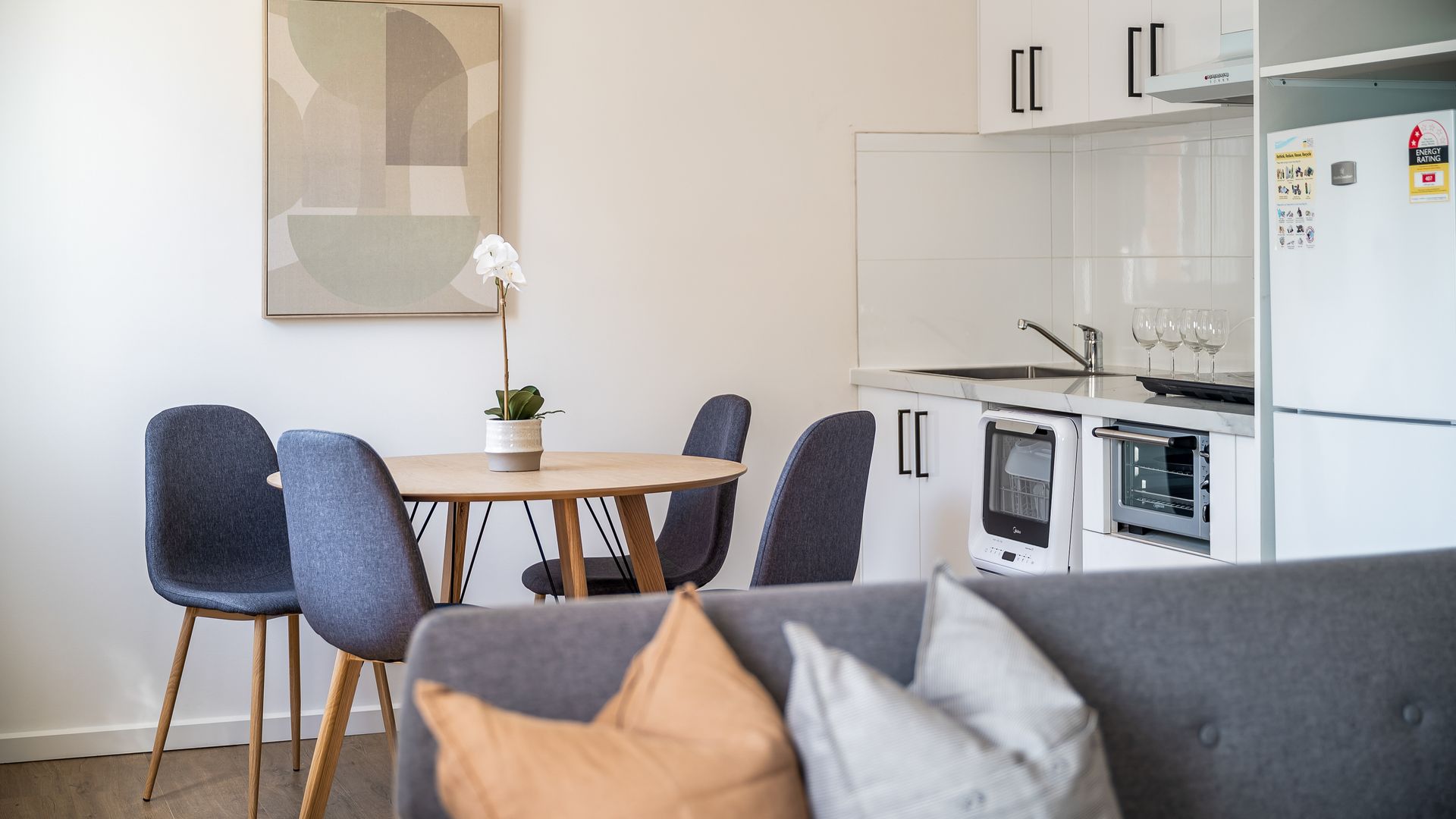 The bedroom has a built in robes and access to the bathroom (with bath/shower above & a toilet). The central living room (with tv) flows into the kitchen/dining area.