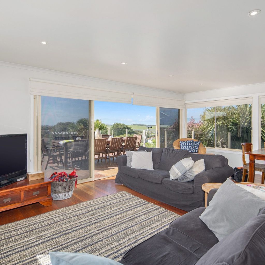 This two storey home has breathtaking ocean views from the large deck, spanning from Smiths Beach to Cape Woolamai. This generous beach house sleeps up to 16 people,ideal for a large family get together or a couple of families sharing a holiday,with 5 bedrooms, 3 bathrooms and two kitchens/ kitchenette downstairs.