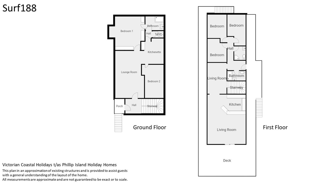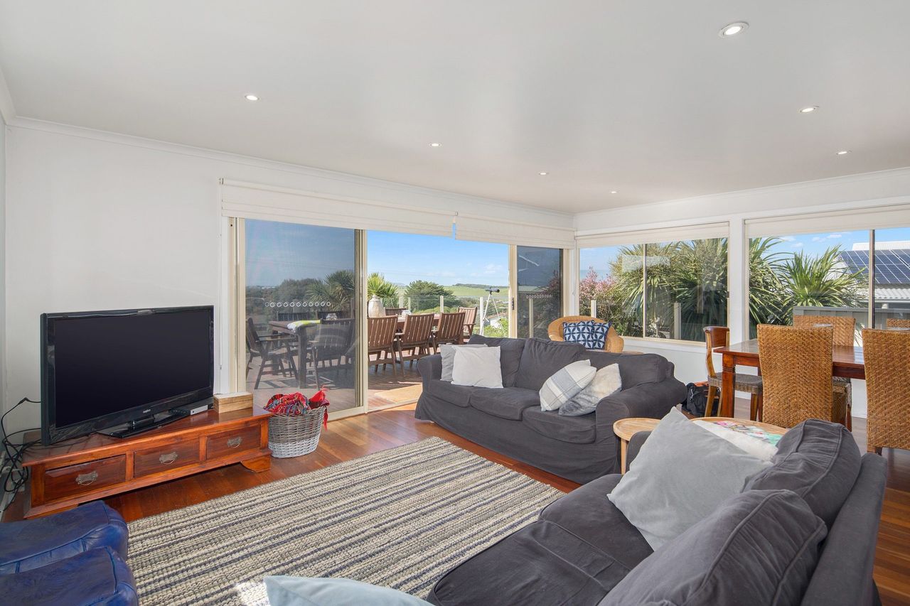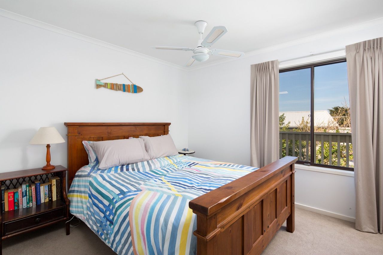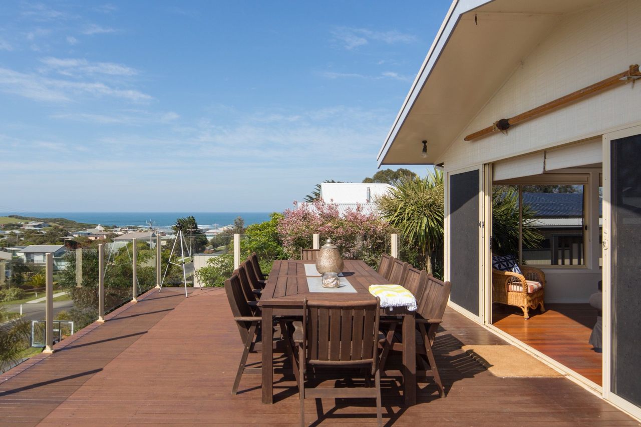 This two storey home has breathtaking ocean views from the large deck, spanning from Smiths Beach to Cape Woolamai. This generous beach house sleeps up to 16 people,ideal for a large family get together or a couple of families sharing a holiday,with 5 bedrooms, 3 bathrooms and two kitchens/ kitchenette downstairs.
