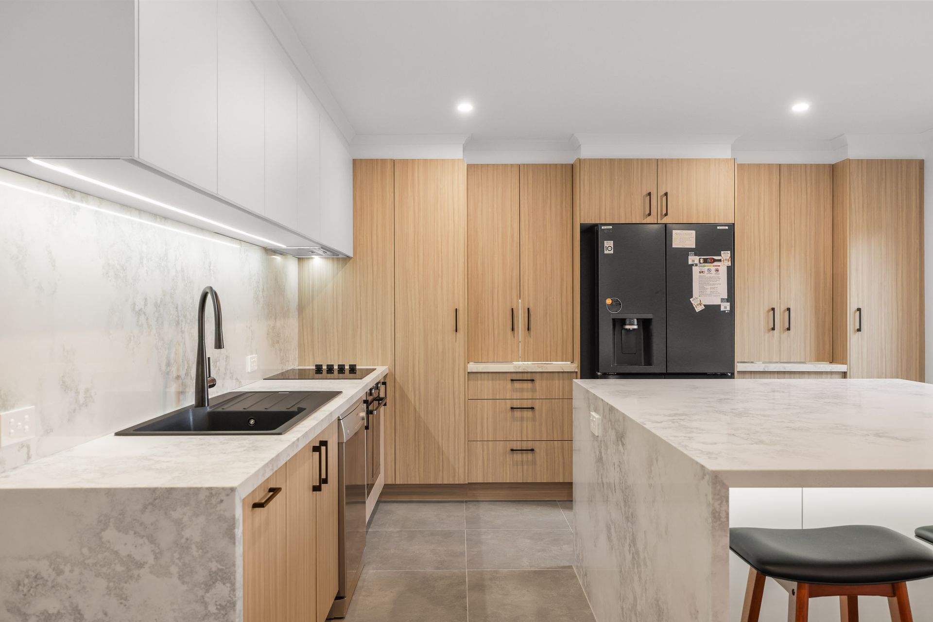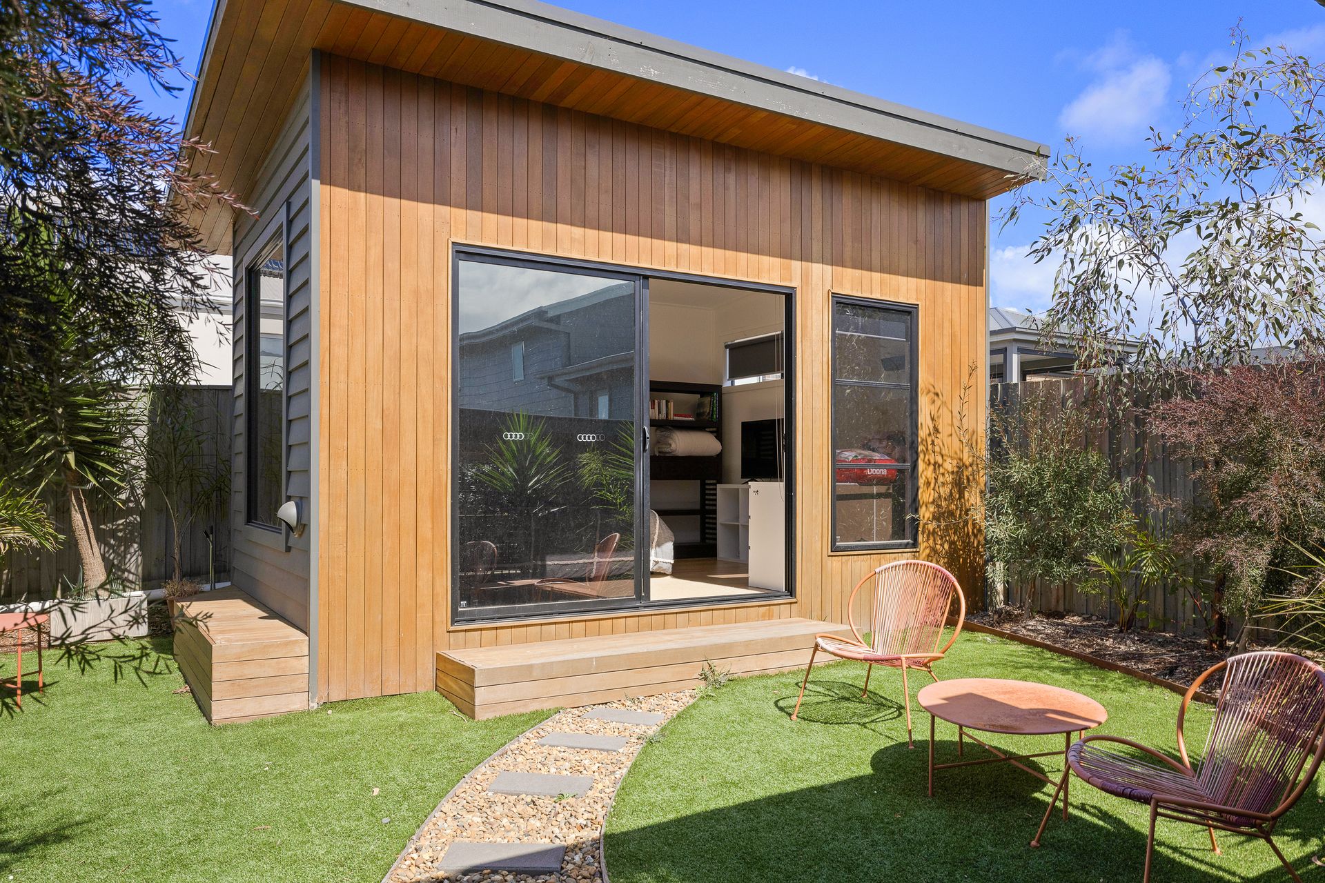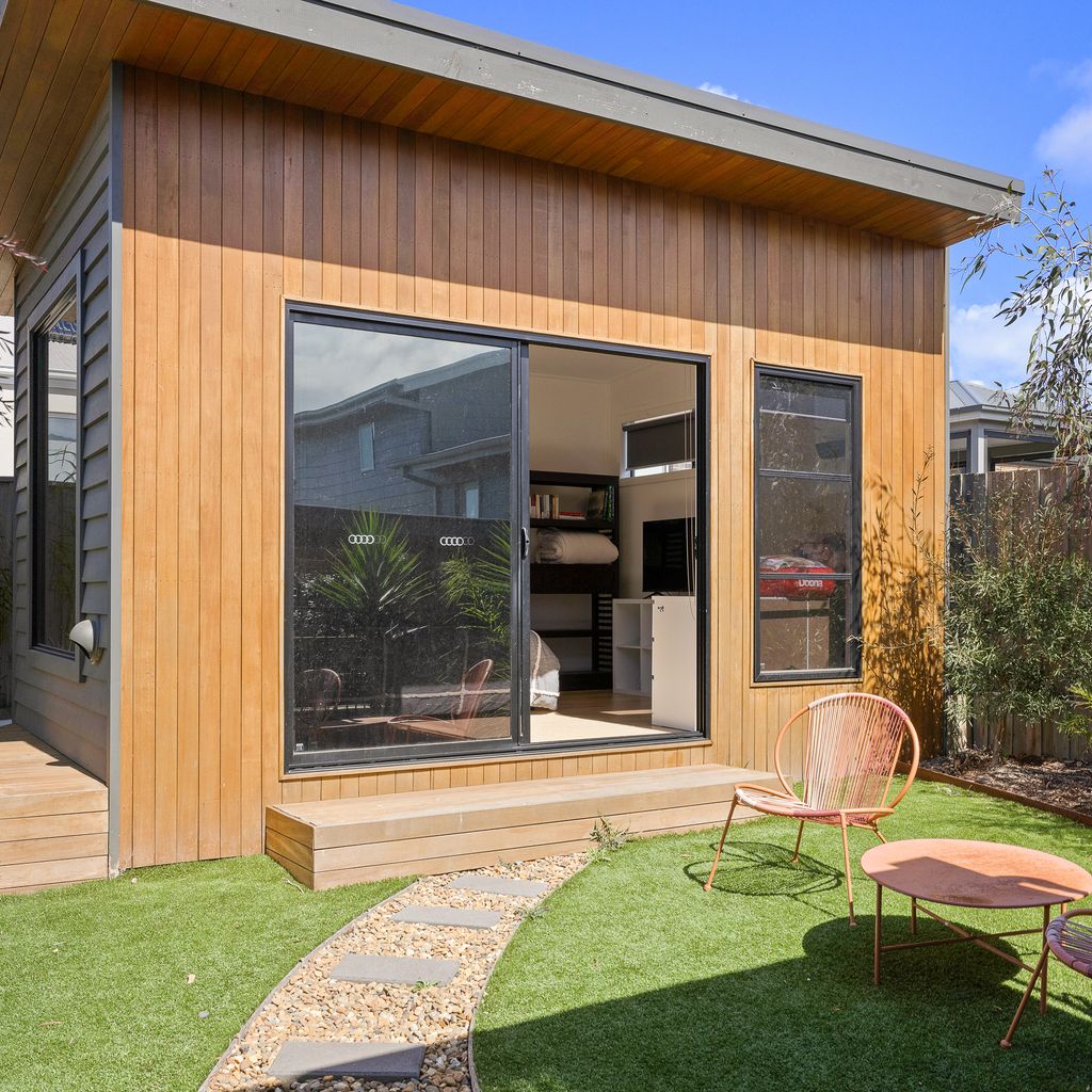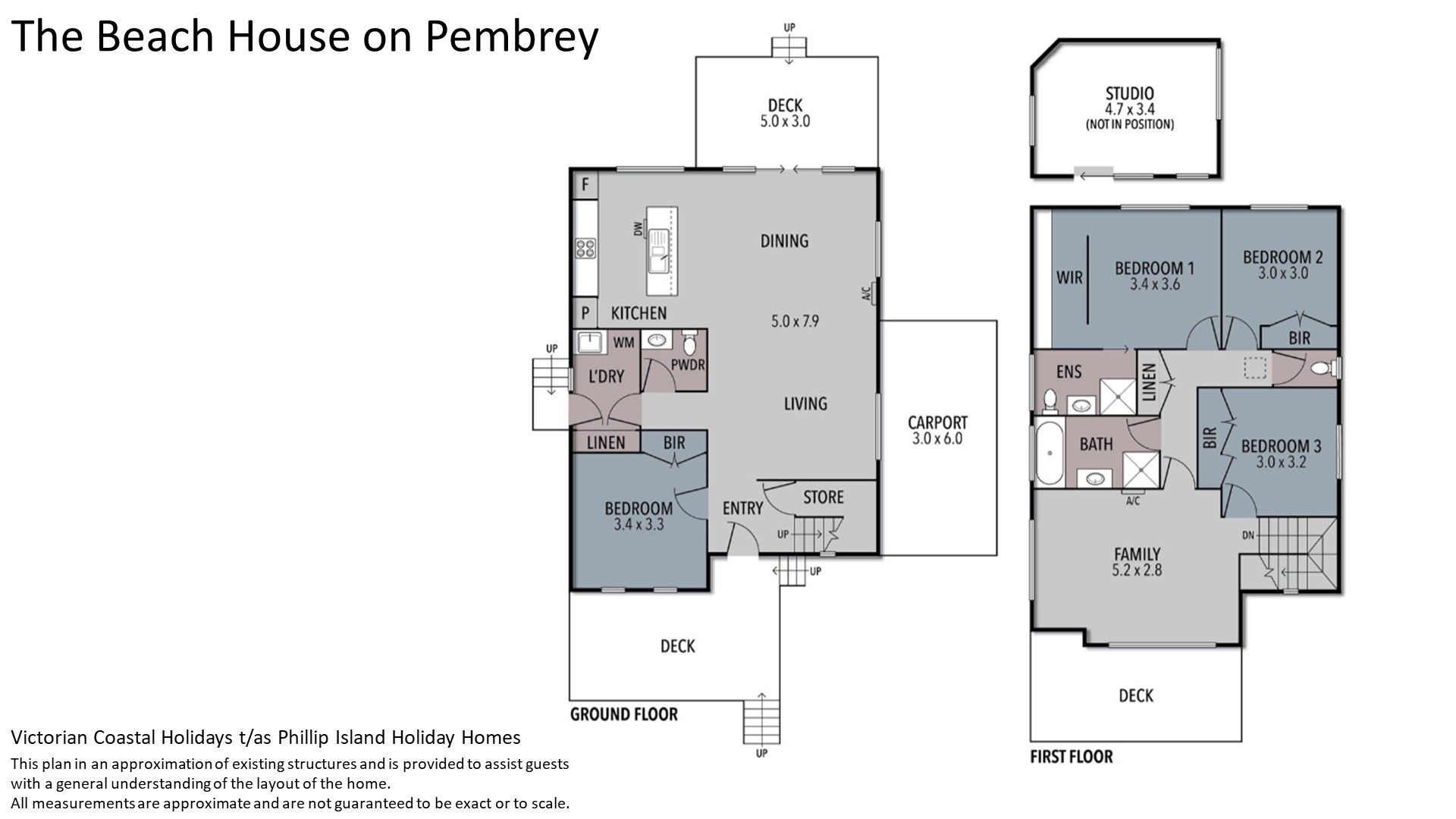 Downstairs is the huge open plan Kitchen/Dining/Living Room (with 55" smart TV) which provides access to the rear Deck, Bedroom 4 (with BIR), a fully equipped Laundry (with washing machine & clothes dryer) and a separate Toilet. Upstairs is the large Family Room (with 40" smart TV), Bedroom 1 which features a 40" smart TV and WIR plus an ensuite (with shower & toilet), Bedrooms 2 & 3 (each with BIR), a Bathroom (with bath & shower), and a separate Toilet. There is a separate Studio in the rear yard which serves as Bedroom 5 (with 43" TV).