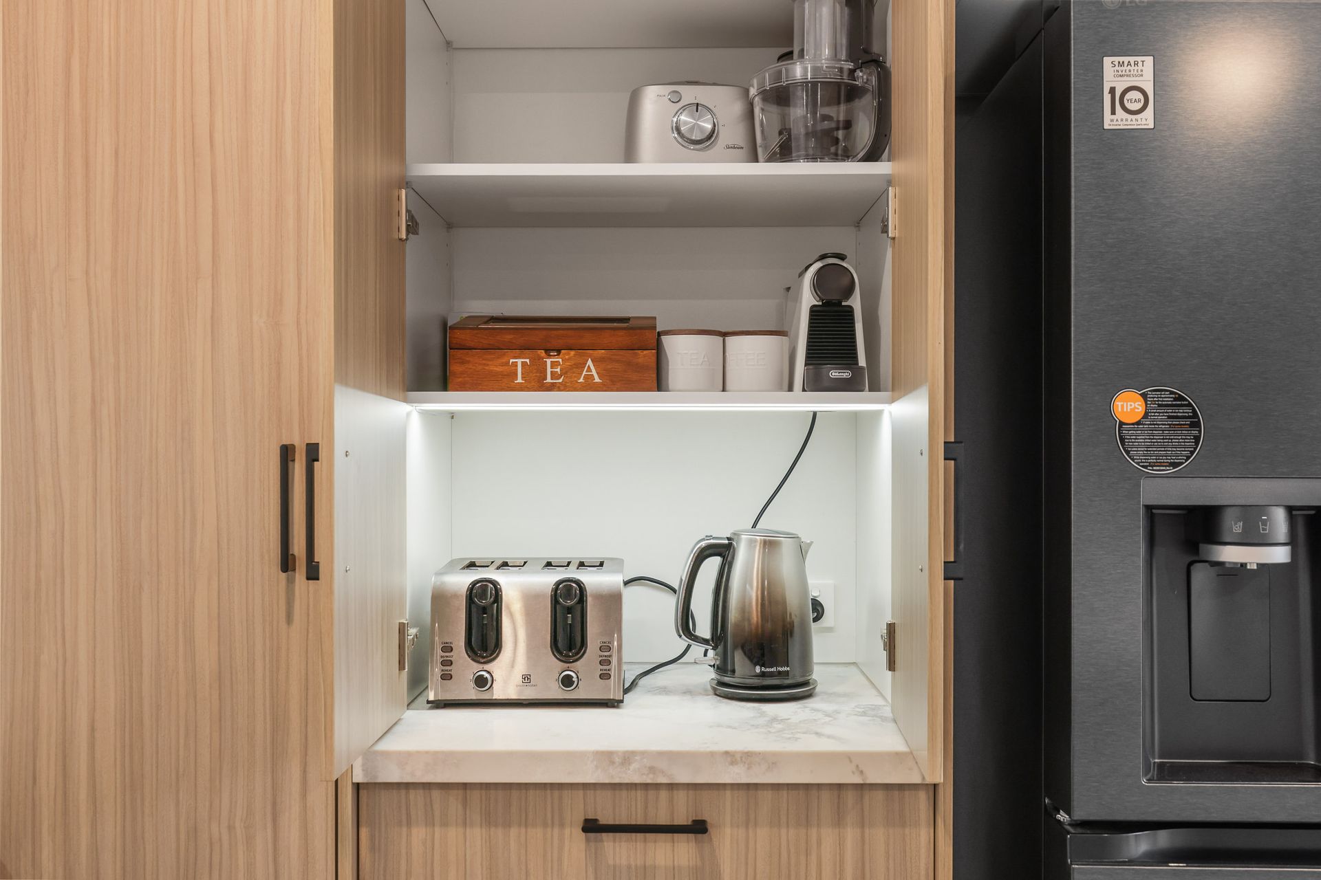 The fully appointed kitchen is equipped with cooking utensils, crockery, cutlery, microwave, Nespresso pod coffee machine, toaster, kettle, etc. plus a double sink, fridge, dishwasher, electric oven and cook top.