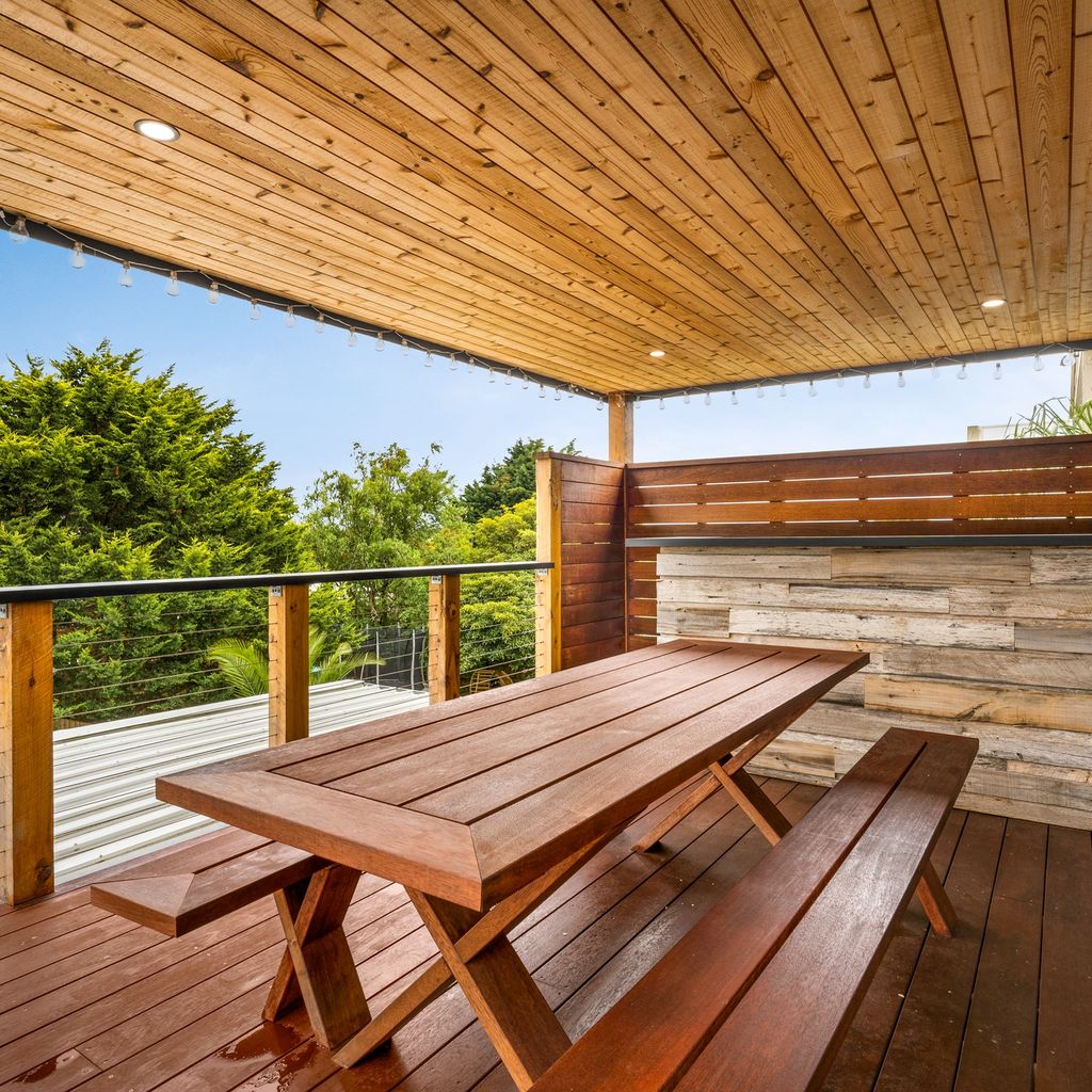 The first floor semi-covered rear deck has a bar, as well as table and chairs for 8 people and a gas bbq and can be accessed internally from the Dining Room and also via a set of external stairs. The downstairs deck can be accessed internally from the 2nd Living Room and overlooks the delightful enclosed yard with an outdoor hot/cold shower. There is space to park up to 4 vehicles (cars and/or a boat) in the two driveways, but guests do not have access to the garage.