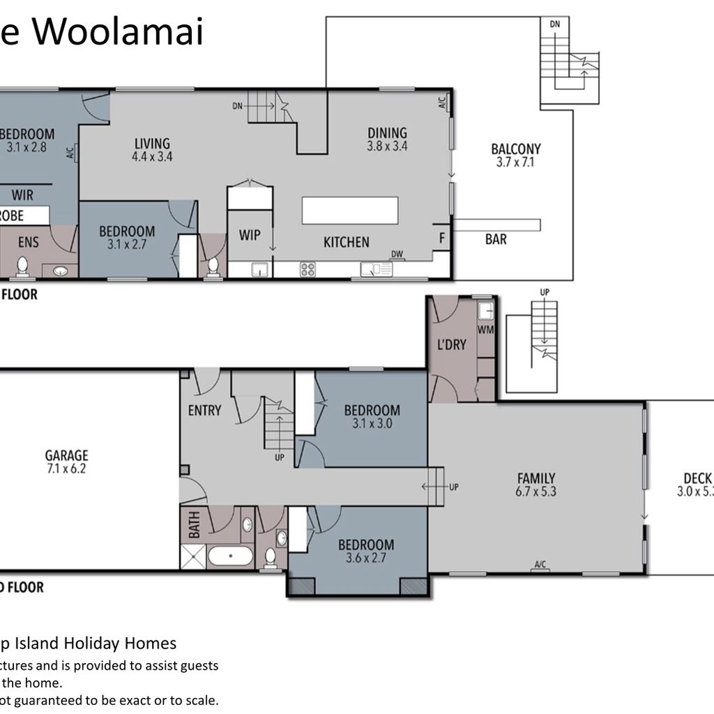 Downstairs is the large 2nd Living/Rumpus room (with TV) which opens on to the rear deck and provides access to the laundry (with washing machine and clothes dryer). A central hallway leads from here to Bedrooms 3 & 4 (each with built in robes), the main bathroom (with bath & shower) plus a separate toilet. Upstairs is the huge light-filled open plan Kitchen (the walk in pantry is not accessible to guests) and Dining/Living Room (with TV), Bedroom 1 with a walk in robe and ensuite (with shower & toilet), Bedroom 2 (with built in robes) and another separate toilet. The first floor rear balcony is accessed from the Living/Dining room.