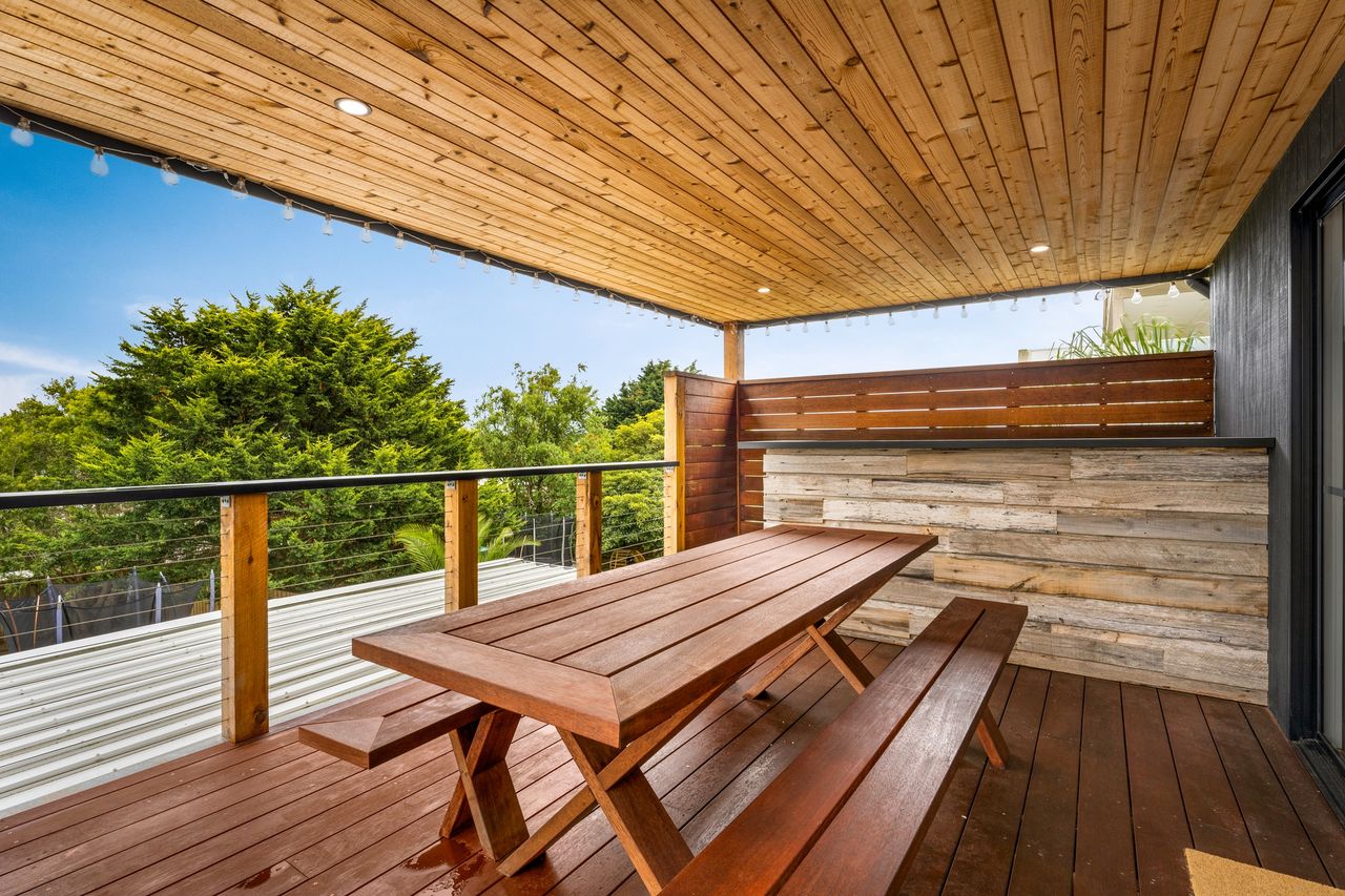 The first floor semi-covered rear deck has a bar, as well as table and chairs for 8 people and a gas bbq and can be accessed internally from the Dining Room and also via a set of external stairs. The downstairs deck can be accessed internally from the 2nd Living Room and overlooks the delightful enclosed yard with an outdoor hot/cold shower. There is space to park up to 4 vehicles (cars and/or a boat) in the two driveways, but guests do not have access to the garage.