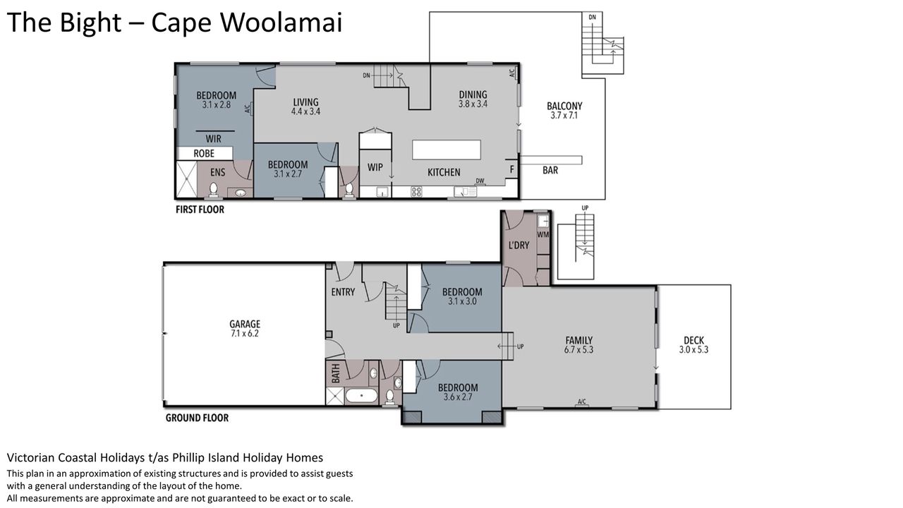 Downstairs is the large 2nd Living/Rumpus room (with TV) which opens on to the rear deck and provides access to the laundry (with washing machine and clothes dryer). A central hallway leads from here to Bedrooms 3 & 4 (each with built in robes), the main bathroom (with bath & shower) plus a separate toilet. Upstairs is the huge light-filled open plan Kitchen (the walk in pantry is not accessible to guests) and Dining/Living Room (with TV), Bedroom 1 with a walk in robe and ensuite (with shower & toilet), Bedroom 2 (with built in robes) and another separate toilet. The first floor rear balcony is accessed from the Living/Dining room.