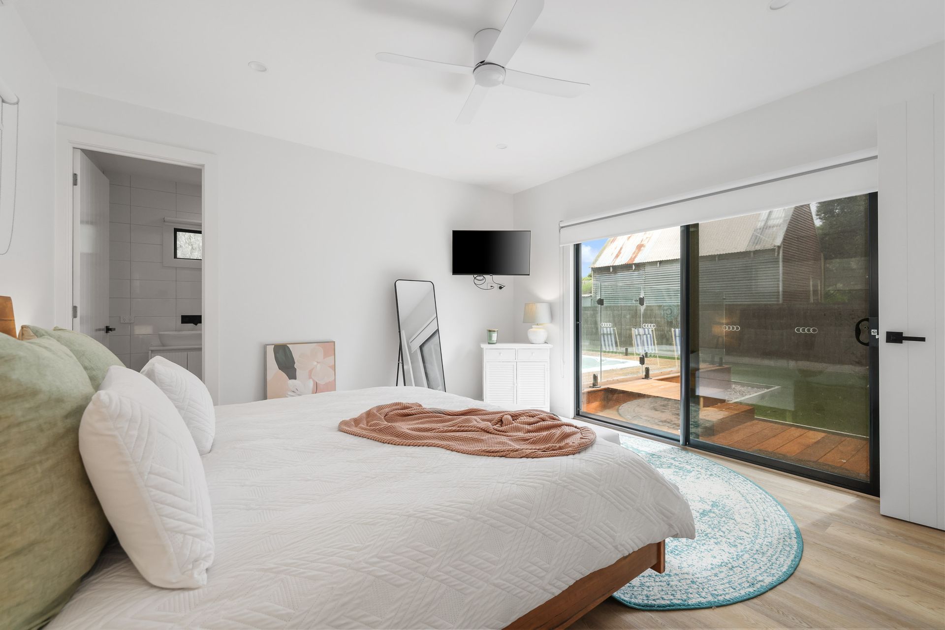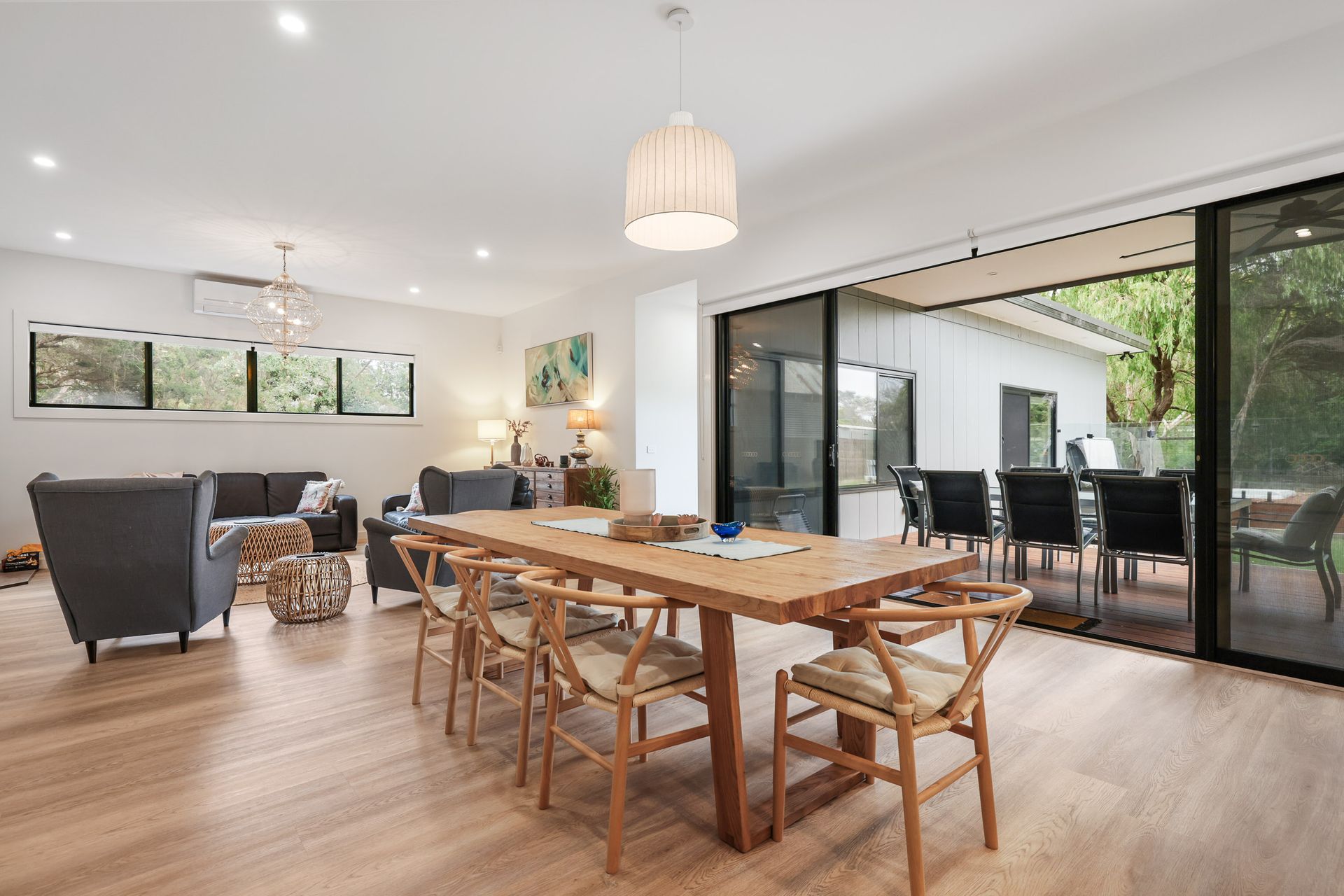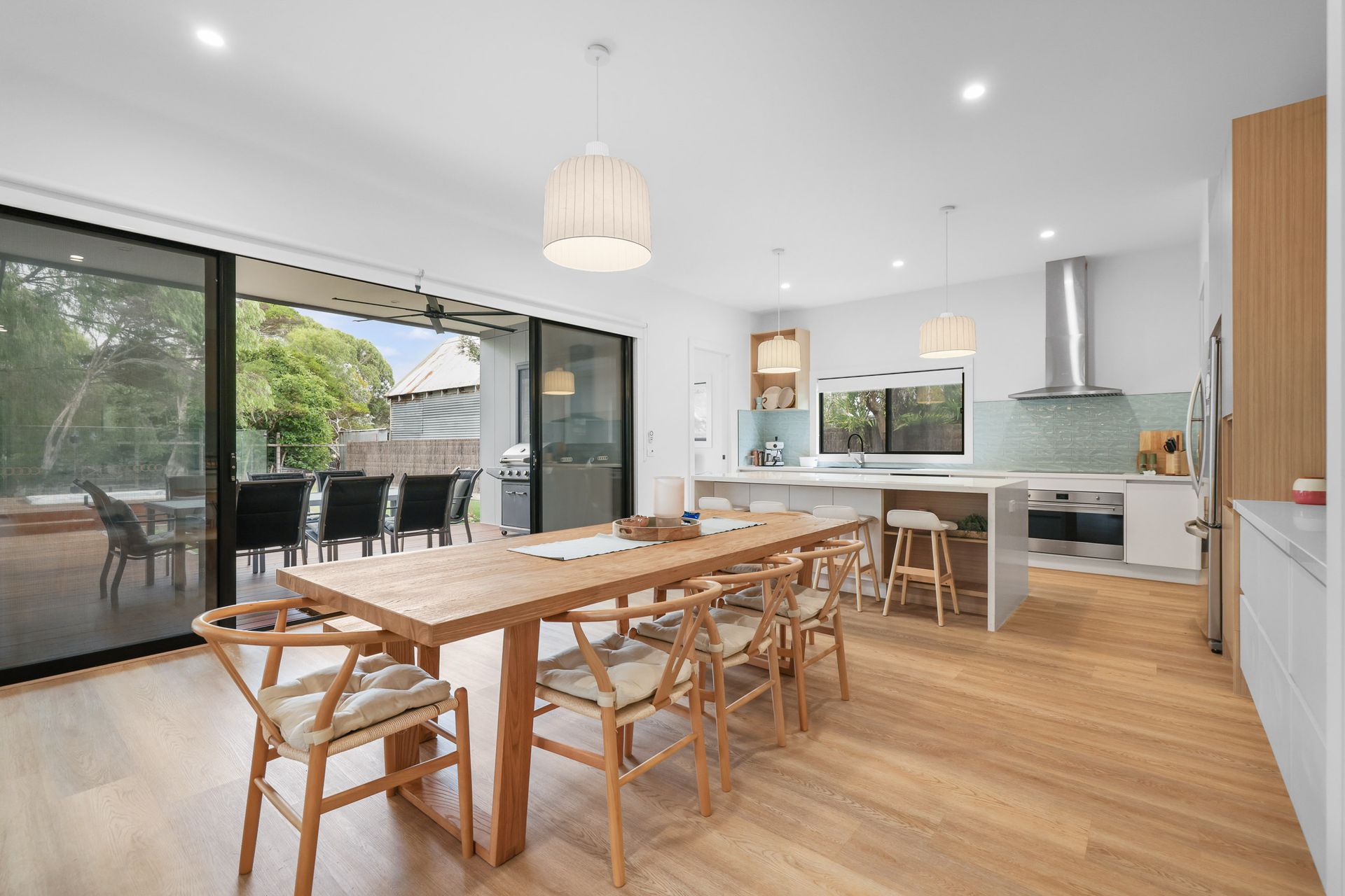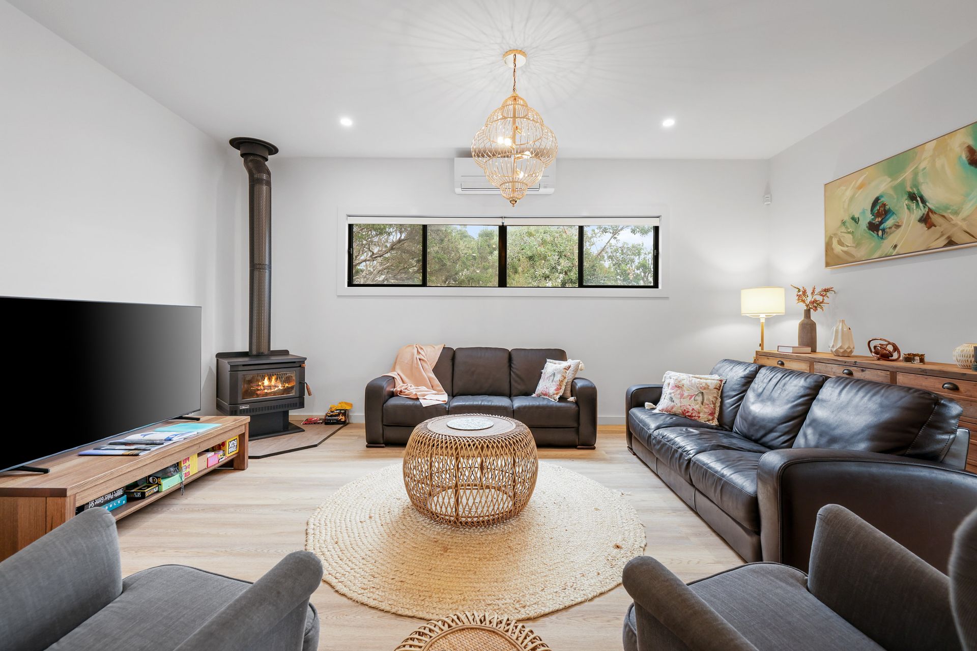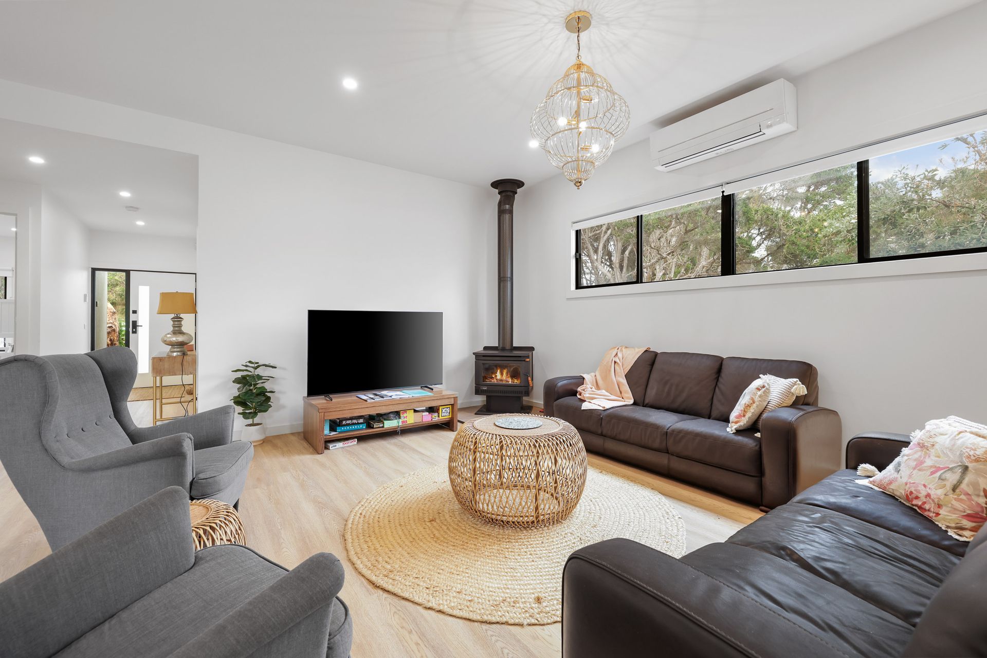 Entering via the front deck, a central hallway leads through to the spacious open-plan Dining/Living area (with 65" Smart TV, a selection of card and board games, a cosy Coonara wood heater, and seating for up to 8 guests), with the kitchen (with WIP) overlooking the space. The area then flows out to the alfresco and deck, creating a relaxed indoor/outdoor feel.
