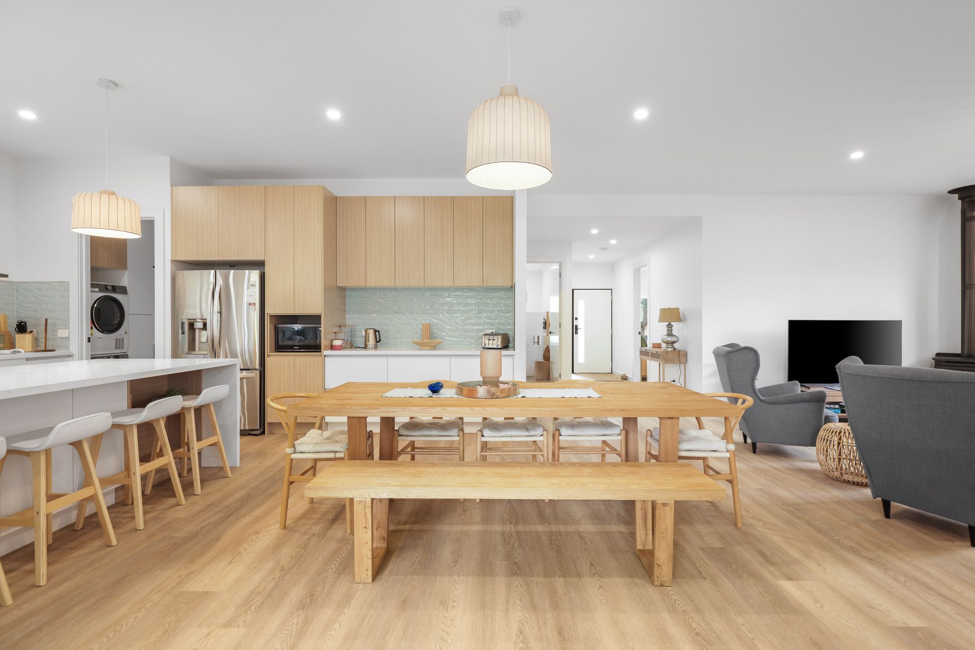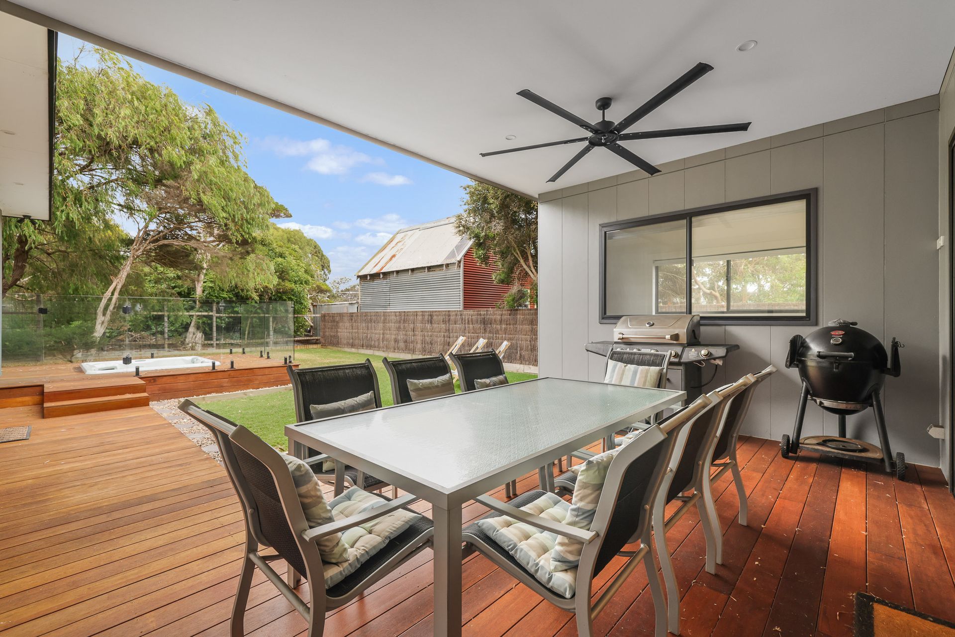 The covered alfresco (with BBQ, ceiling fan, and seating for 8 people) showcases a spacious timber deck that flows effortlessly from the indoor living area through wide sliding doors, creating a seamless indoor-outdoor experience.