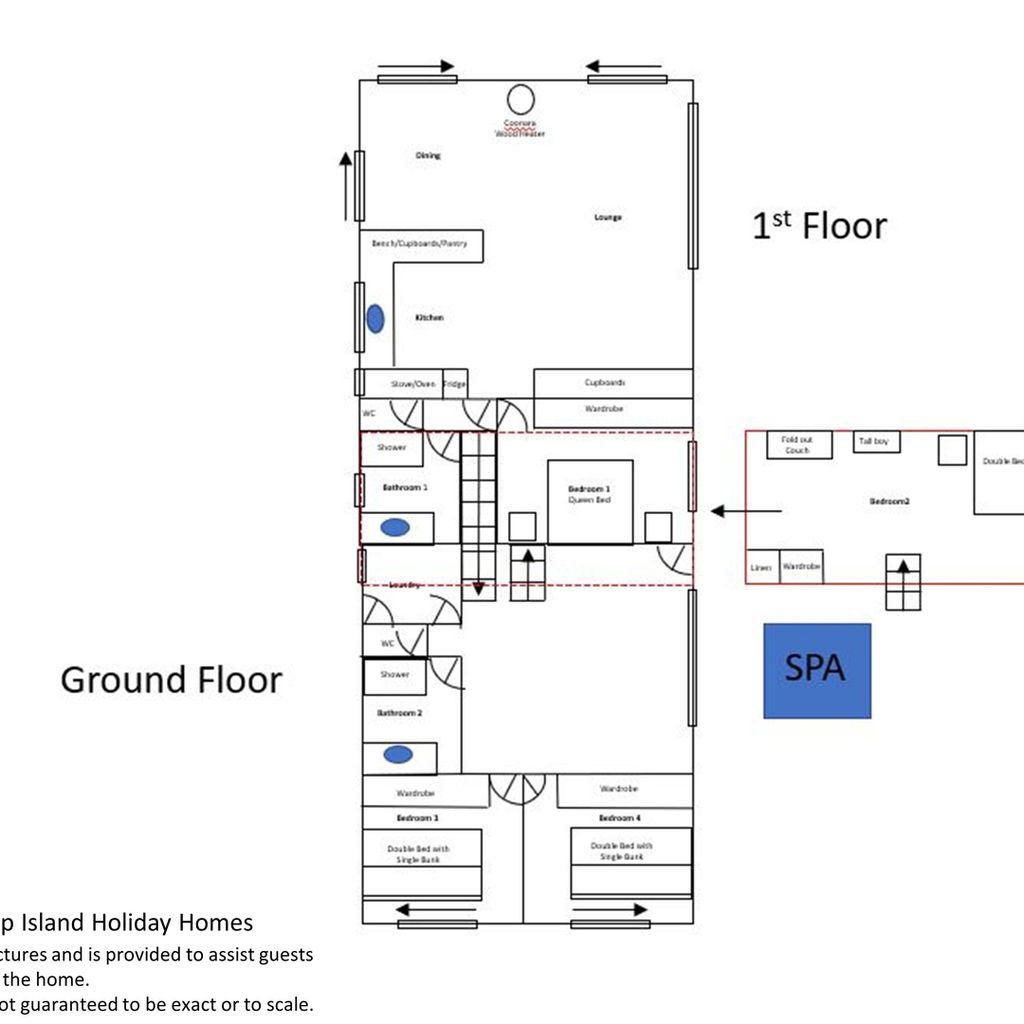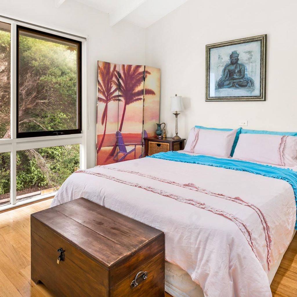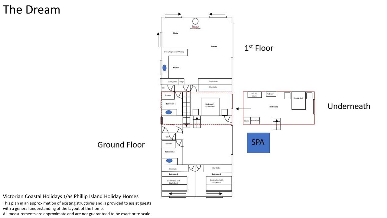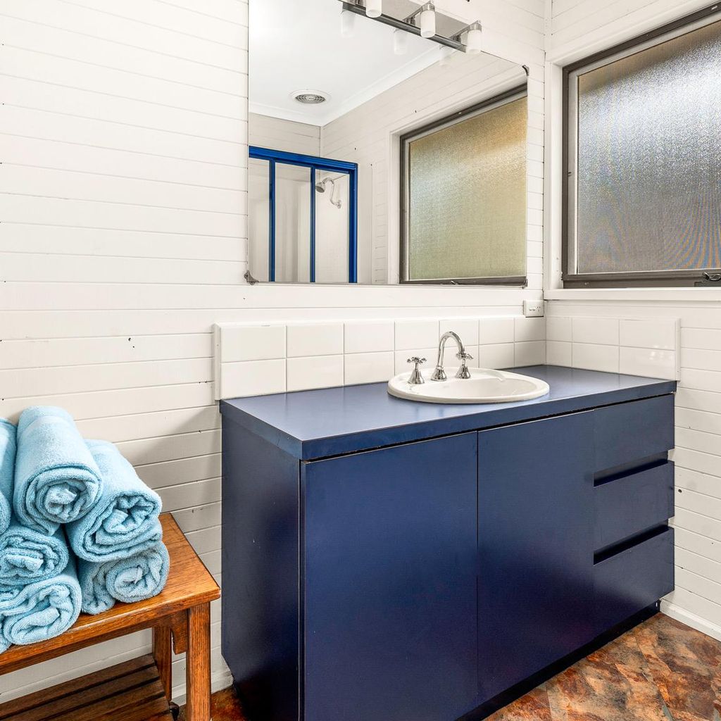 The ground floor has the family room (with TV & DVD player) as well as bedrooms 3 & 4 (both with BIR) as well as the main bathroom (with shower) and a separate toilet. Upstairs is the open plan kitchen/dining/lounge room (with smart TV and coonara wood heater - wood not provided) that leads out to the large front and side deck. On this level is also the master bedroom (with BIR) and a second bathroom (with shower) and separate toilet. The bottom level of the home is bedroom 2 which also features BIR.