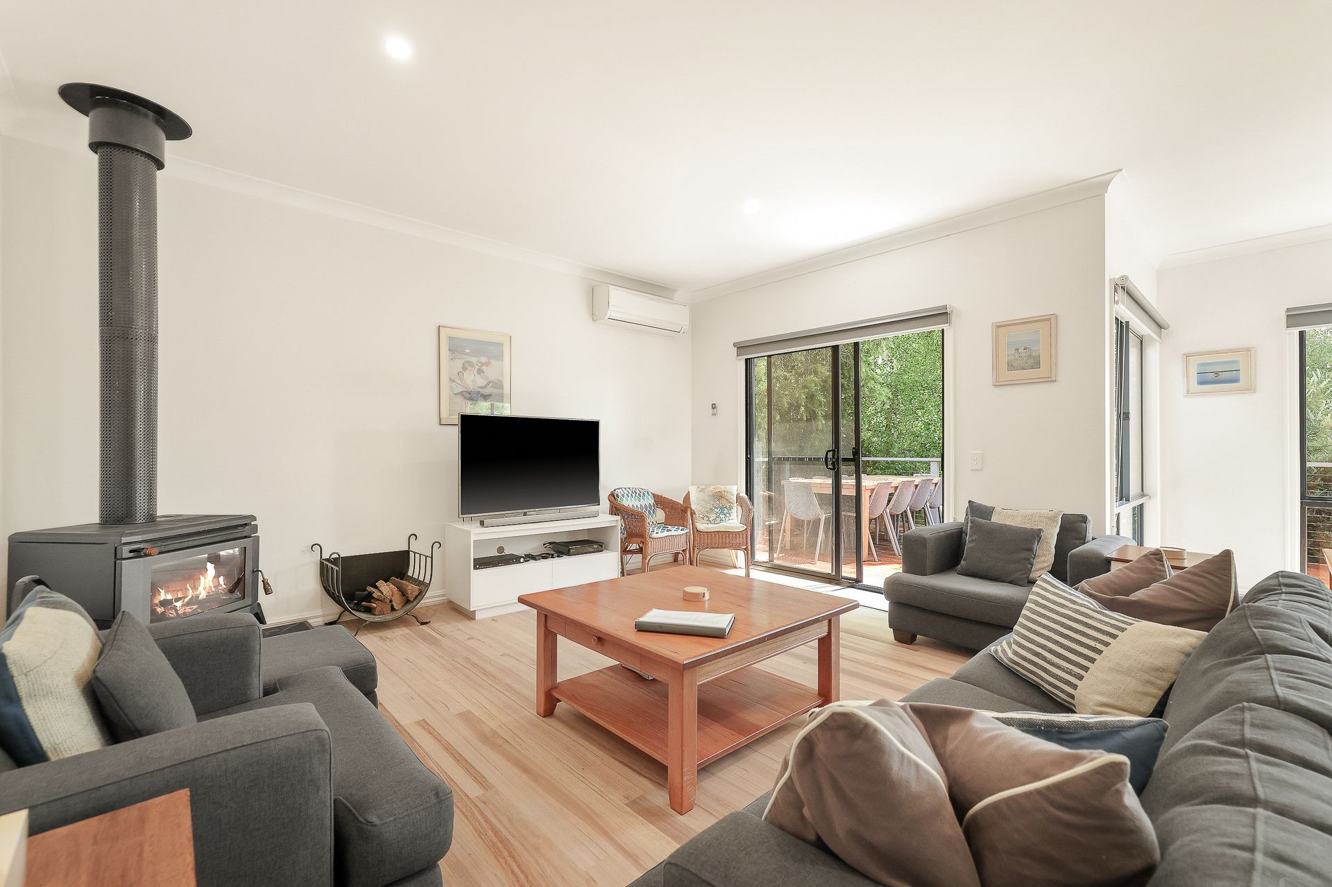The home is equipped with a reverse-cycle split system unit in the living area and in each of the bedrooms. Separate heaters and fans are also available in each bedroom plus electric blankets on all beds except the top bunks. Additionally, there is a coonara-style wood heater, with a small amount of wood supplied to get you started.
