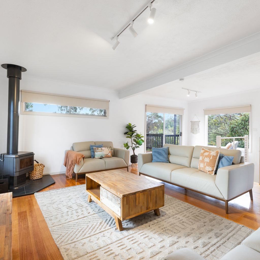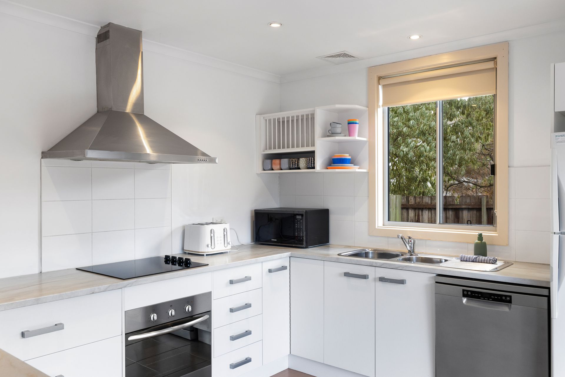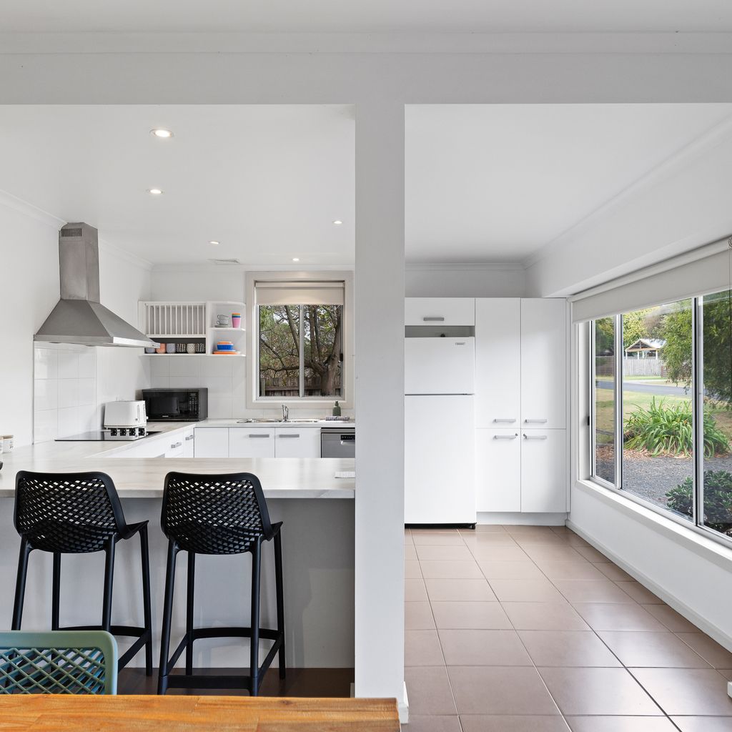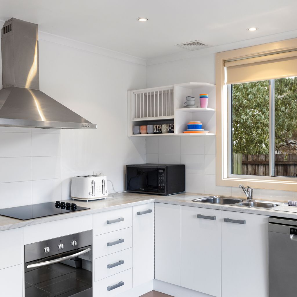 Downstairs is the open plan Kitchen/Dining room (with 43" smart TV) which leads to Bedroom 1 with BIR and an ensuite (with shower & toilet). The European Laundry (with washing machine) is up a few steps of the stairs that go to the first floor. Upstairs is the large Living Room (with 50" smart TV & Coonara wood heater) that leads to Bedrooms 2 and 3, a Bathroom (with shower & toilet) and provides access to the rear Balcony.
