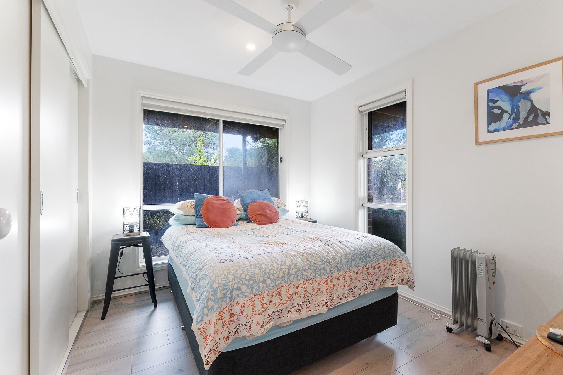 There are two wall mounted reverse cycle split-systems; one in the upstairs Living/Kitchen/Dining room and the other at the base of the stairs, ceiling fans in all bedrooms, plus 4 x additional stand-alone heaters and 2 x fans which can be used where required.